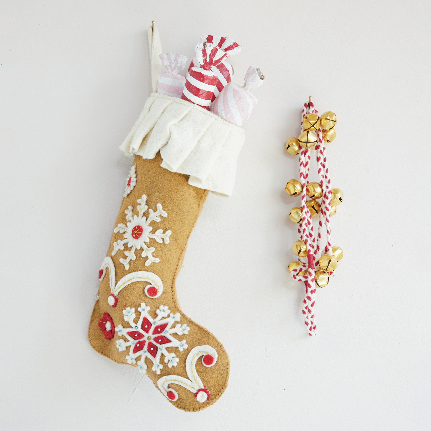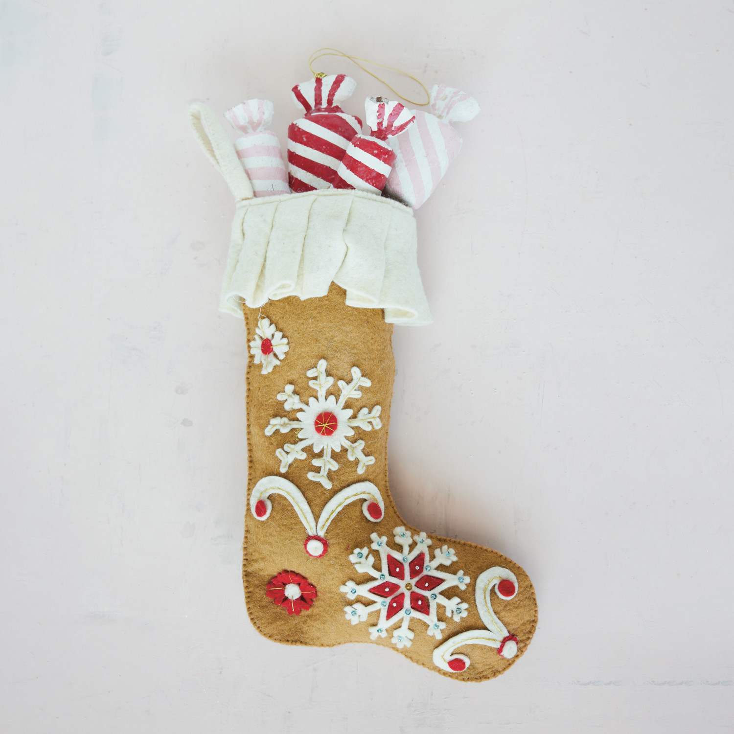 Catalog Name: 19"H Handmade Wool Felt Stocking w/ Snowflakes, Embroidery, Applique & Ruffle Cuff, Brown, Cream Color & Red
