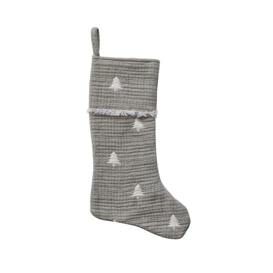 Catalog Name: 20"H Woven Cotton Double Cloth Stocking w/ Trees, Eyelash Fringe & Hand-Embroidered Kantha Stitch, Sage Color & Natural