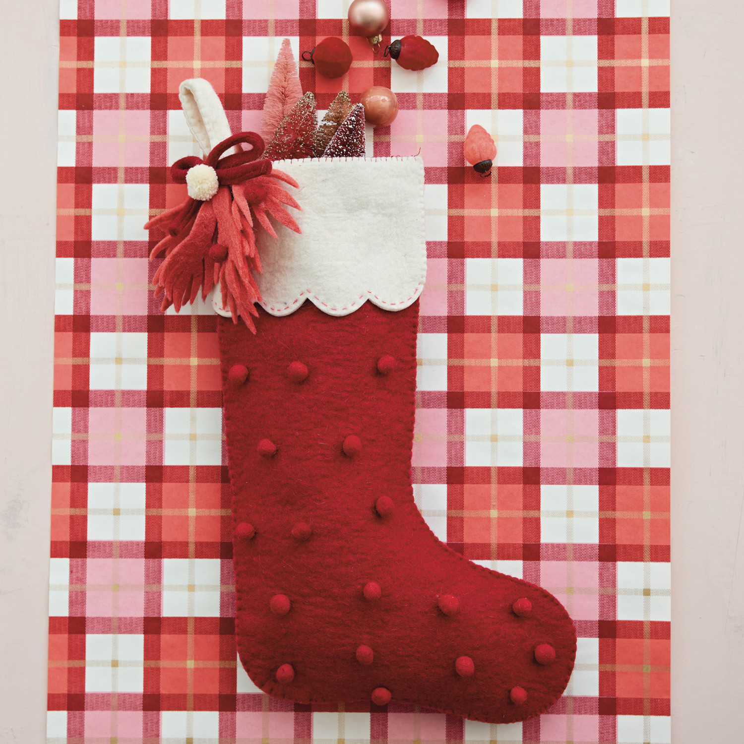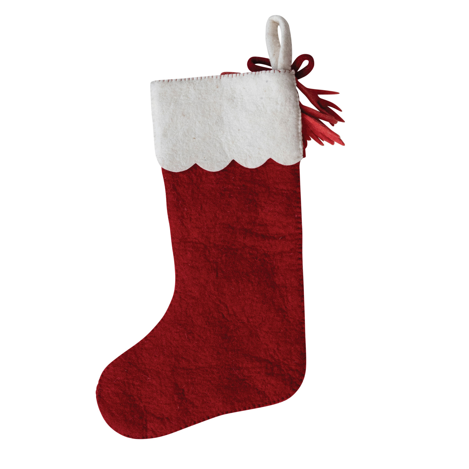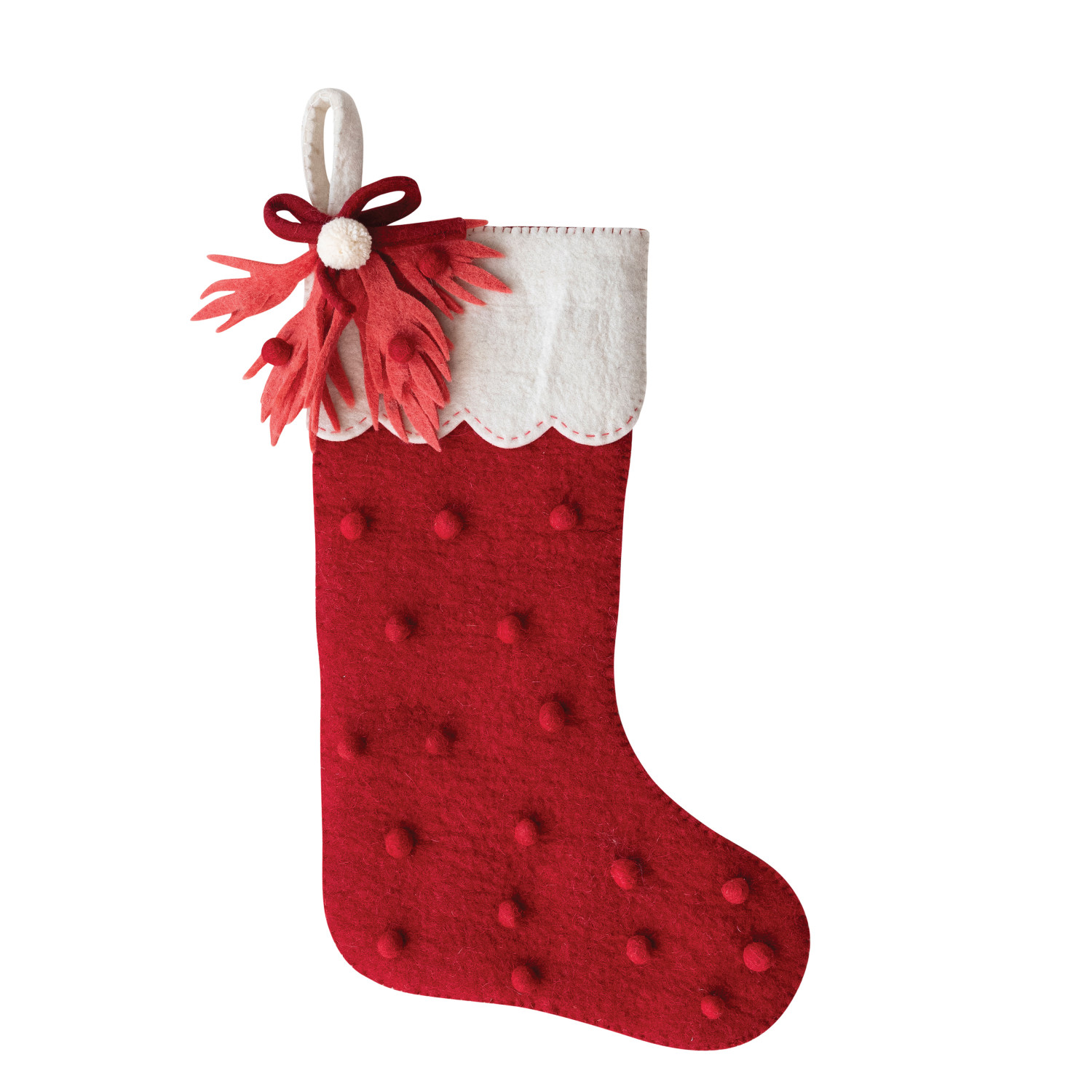 18"H Handmade Wool Felt Stocking with Scalloped Cuff, Pom Pom, Bow & Leaves