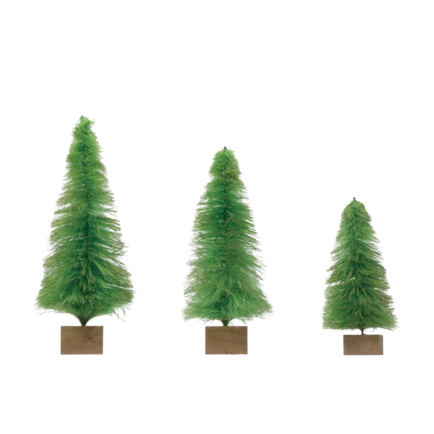 Catalog Name: 6-3/4" Round x 13-3/4"H, 5-1/2" Round x 11-3/4"H & 4-3/4" Round x 8-3/4"H Sisal Bottle Brush Trees w/ Gold Finish Wood Bases, Spearmint Color, Set of 3