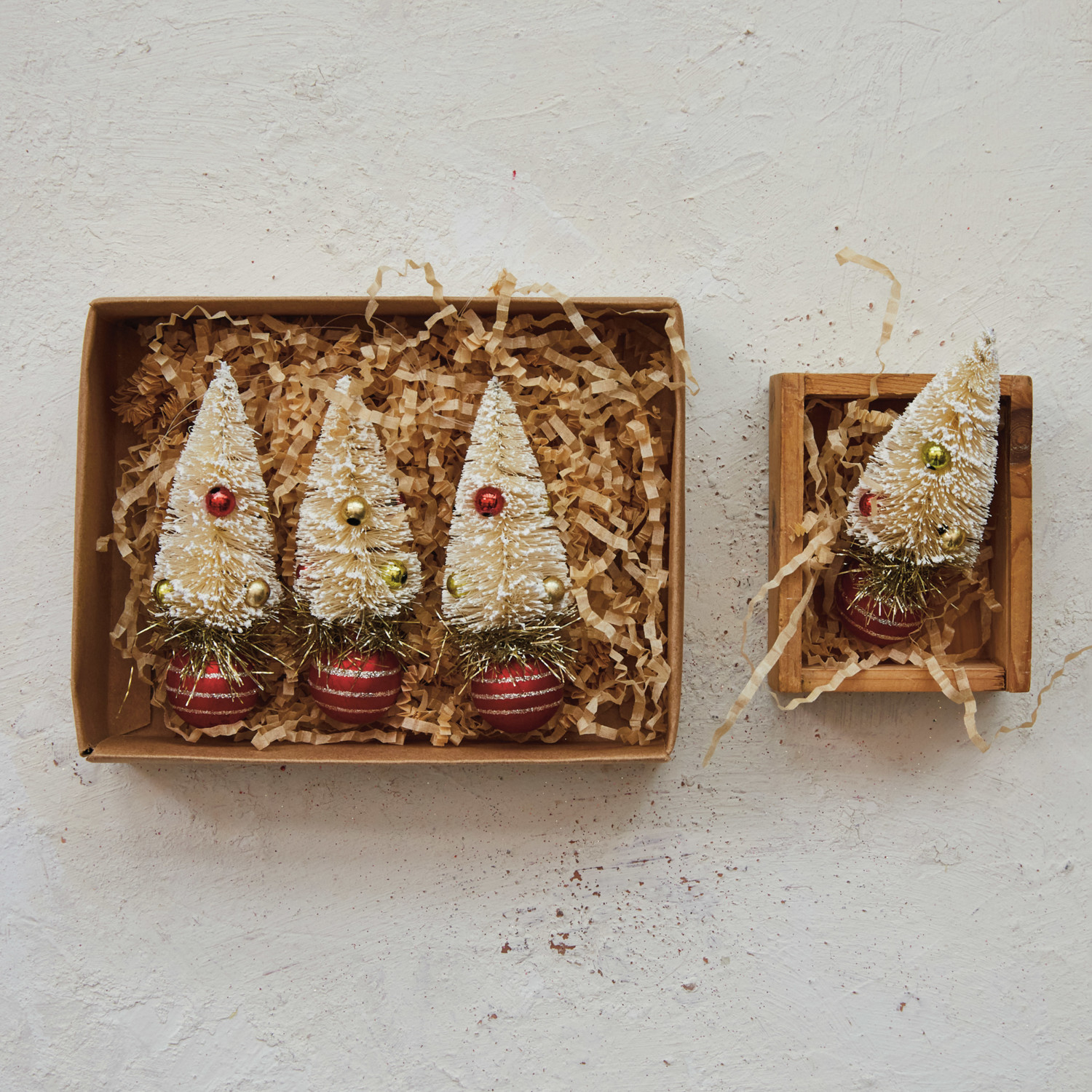 Catalog Name: 1-1/4" Round x 3-1/2"H Sisal Bottle Brush Tree Ornaments w/ Beads, Glass Ball Base & Glitter, Red & Cream Color, Boxed Set of 4