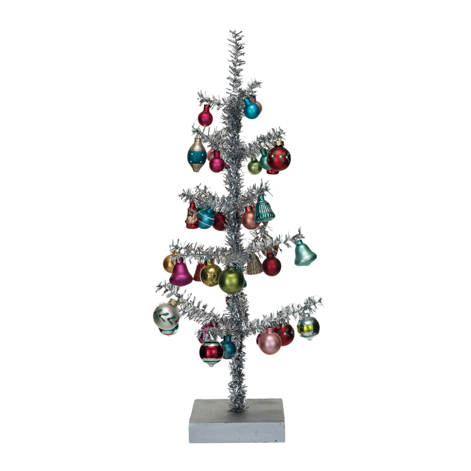 Catalog Name: 10" Round x 20"H Tinsel Tree w/ Glass Ornaments & MDF Base, Silver Finish, Multi Color