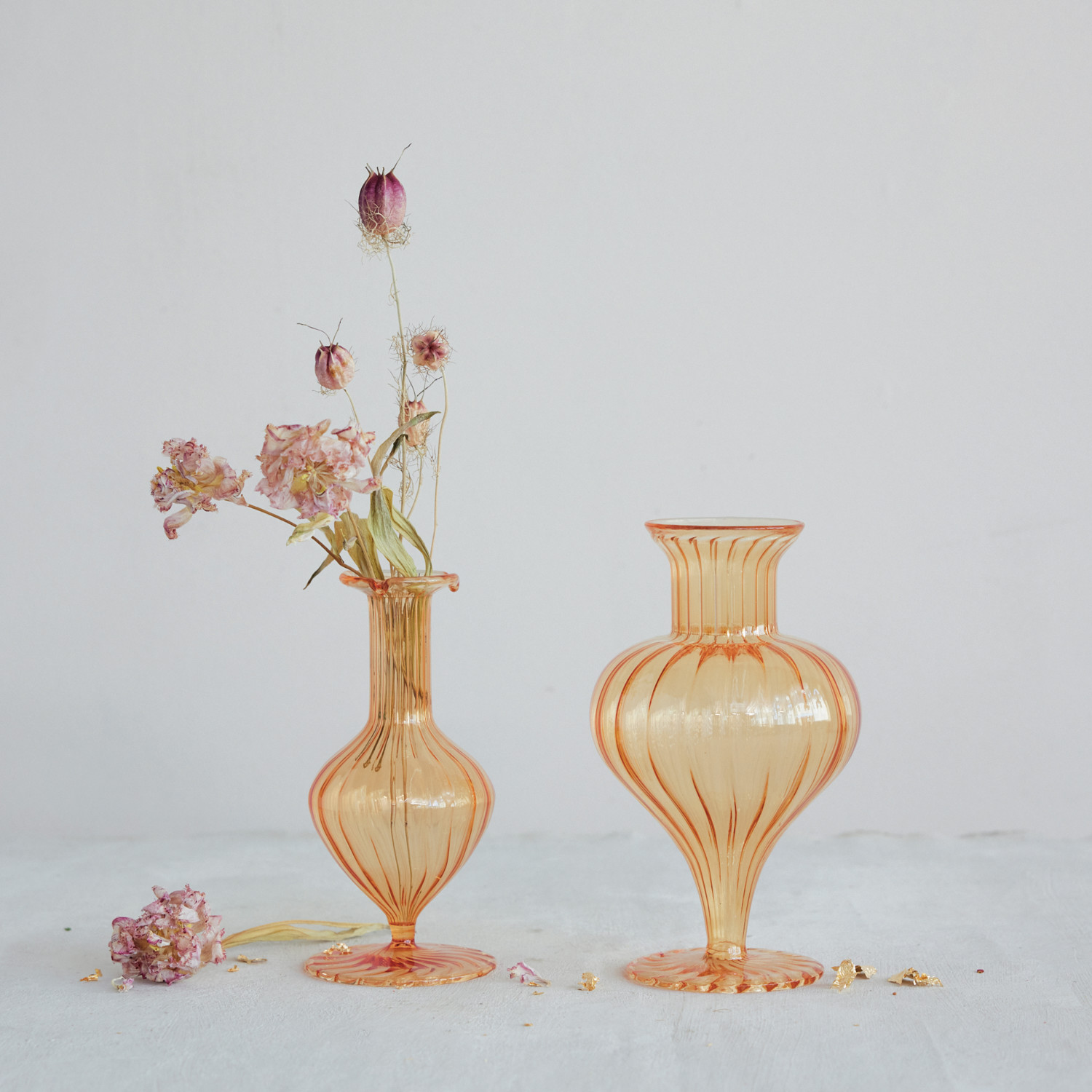 Hand-Blown Fluted Glass Footed Vase, Apricot Color, 2 Styles