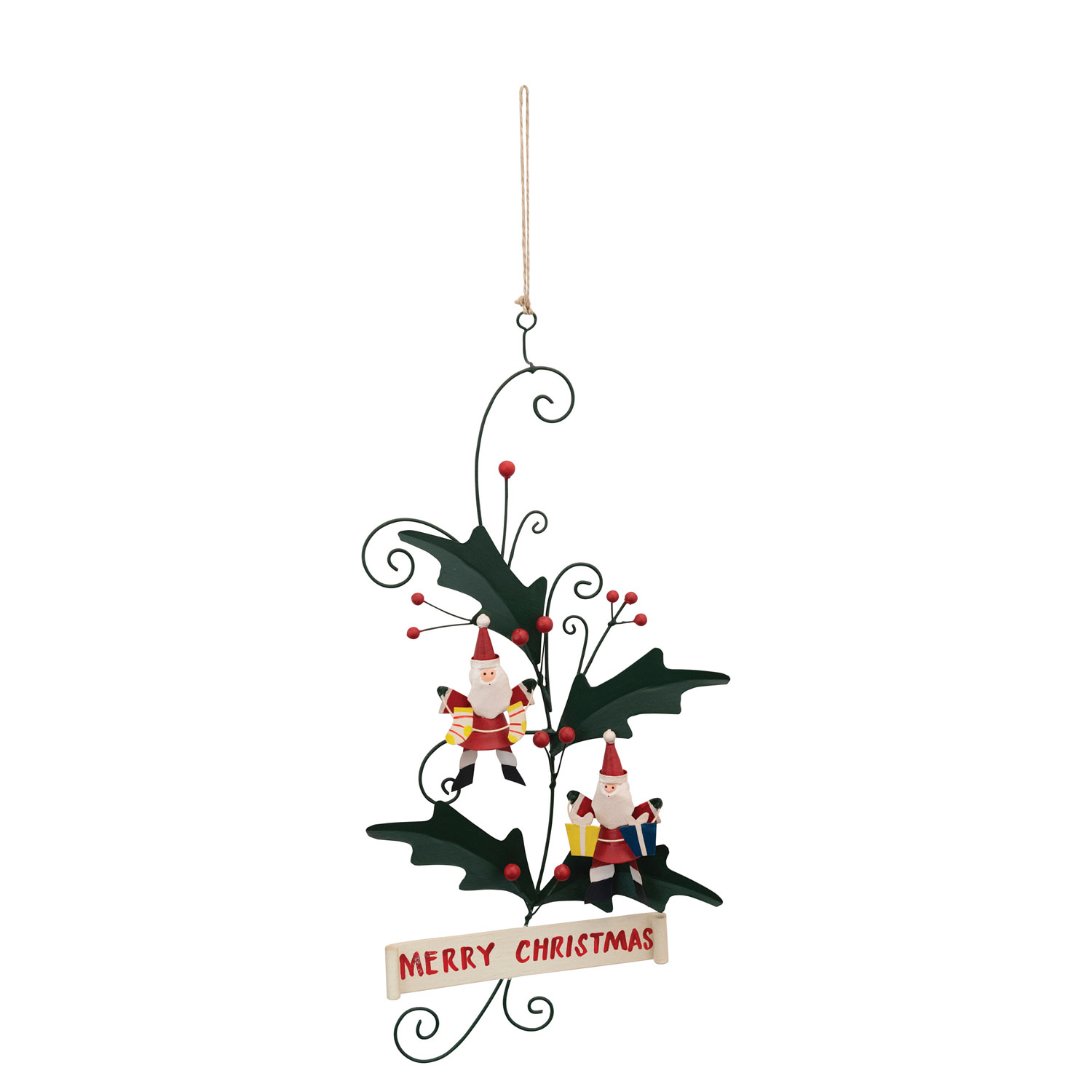 Catalog Name: 7"W x 12-1/2"H Hand-Painted Tin Holly Sign with Santas "Merry Christmas", Multi Color