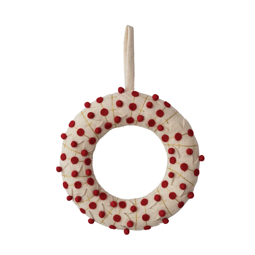 Catalog Name: 14" Round Handmade Wool Felt Pom Pom Wreath w/ Metallic Gold Thread Embroidery, Cream Color & Red