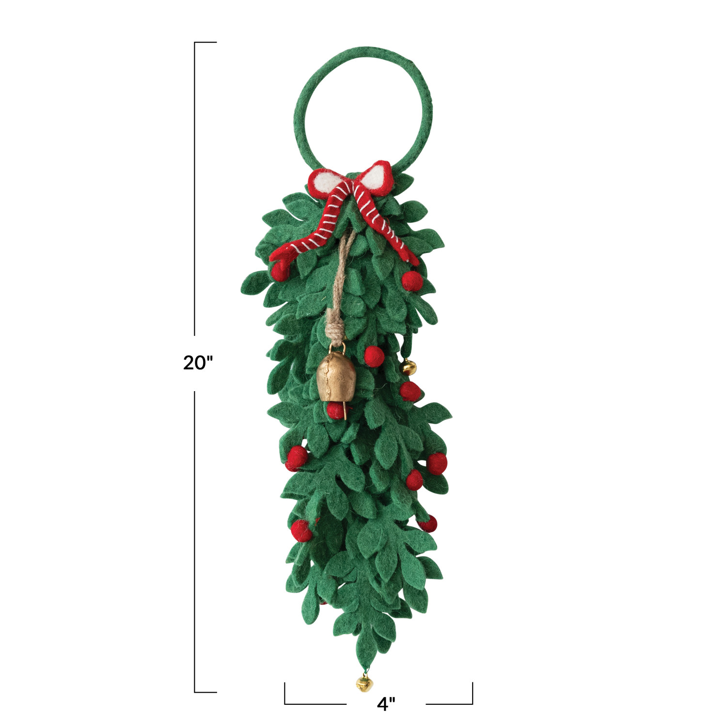 Catalog Name: 4"W x 20"H Handmade Wool Felt Leaves & Berries Door Hanger w/ Striped Bow & Jingle Bells, Green, Red & Gold Finish