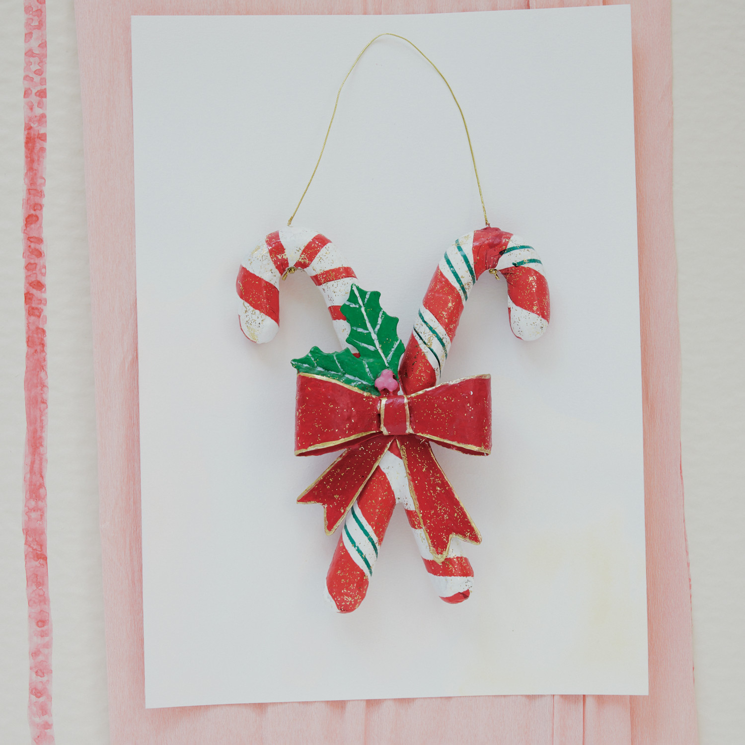 Handmade Metal & Paper Candy Cane Wall Decor with Bow & Holly Leaves ©