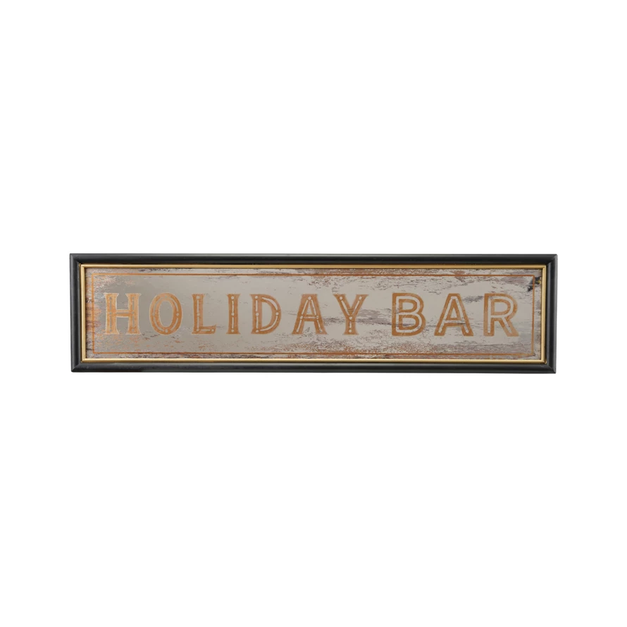 Wood Framed Wall Decor with Antiqued Mirror "Holiday Bar", Black & Gold Finish ©