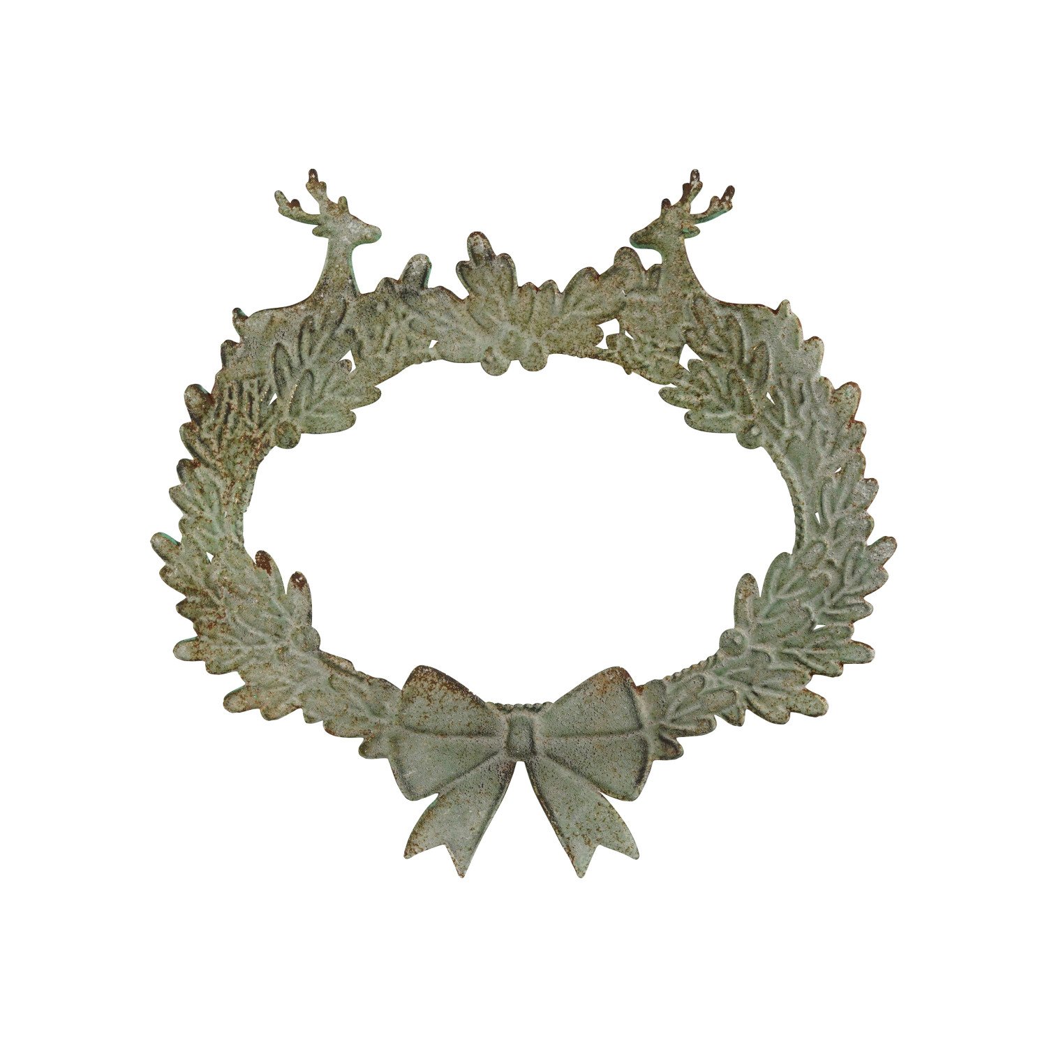 Embossed Metal Wreath Wall Decor with Deer & Bow, Distressed Patina Finish