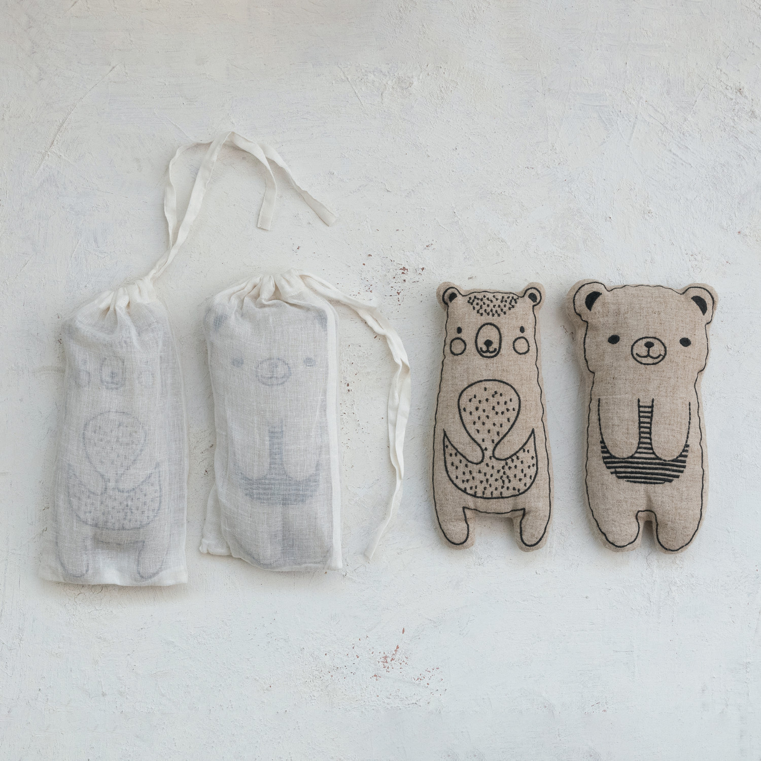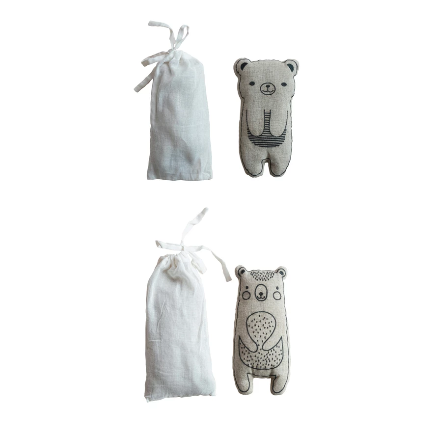 Catalog Name: 9"L Microwaveable Bear Shaped Hot/Cold Pack w/ Embroidered Linen Blend Cover Filled w/ Natural Lentils & Lavender in Drawstring Bag, Natural & Black, 2 Styles