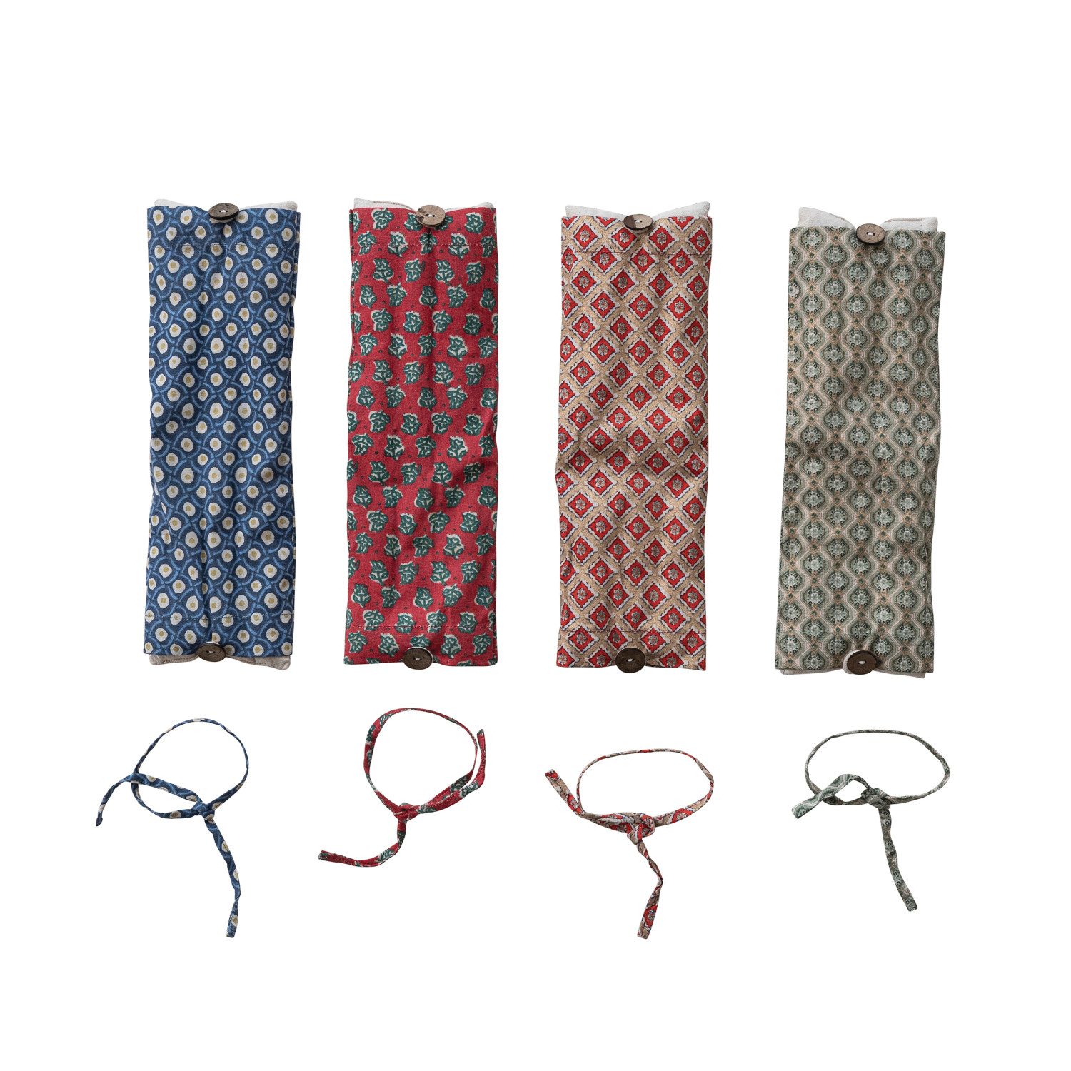 Catalog Name: 12"L x 4"W Microwaveable Hot/Cold Pack w/ Coconut Shell Buttons & Cotton Printed Cover Filled w/ Natural Lentils & Lavender Tied w/ Printed Cotton Tape, Multi Color, 4 Styles