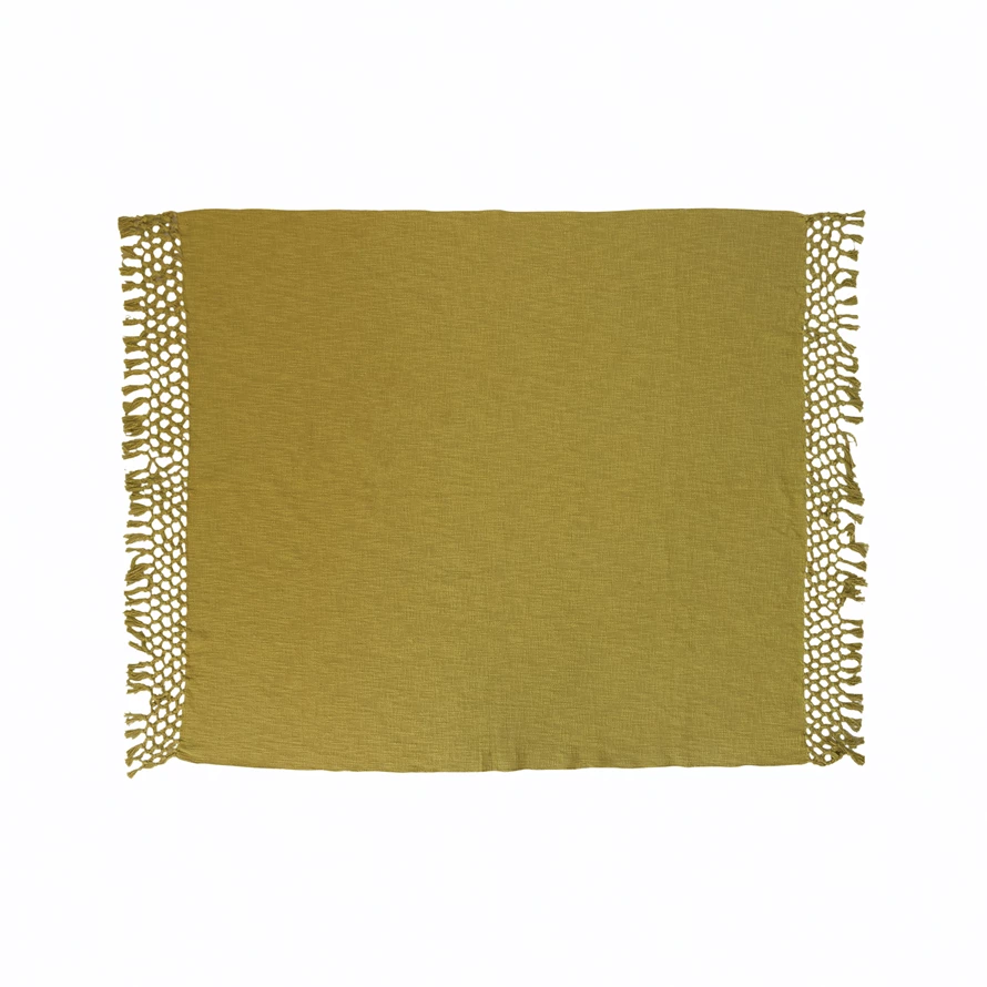 This boho-inspired throw blanket showcases supple cotton construction finished with a stunning crocheted edge. Chartreuse cotton throw blanket with decorative crocheted edge. Add a touch of stylish warmth to any lounge space with this luxurious throw blanket. Machine wash with mesh bag or hand wash.