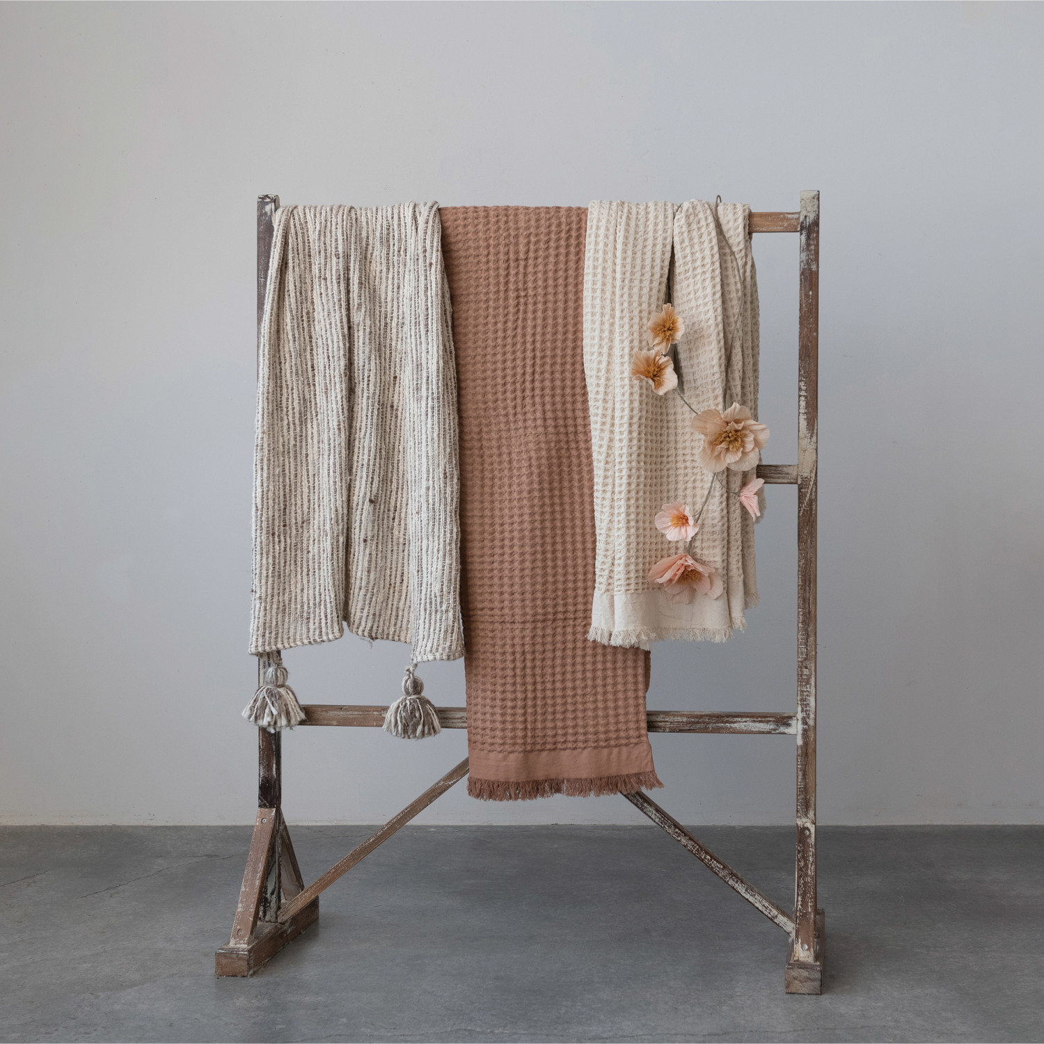 A cozy and classic throw blanket with a waffle weave texture and soft fringe edges. Machine wash cold, gentle cycle.