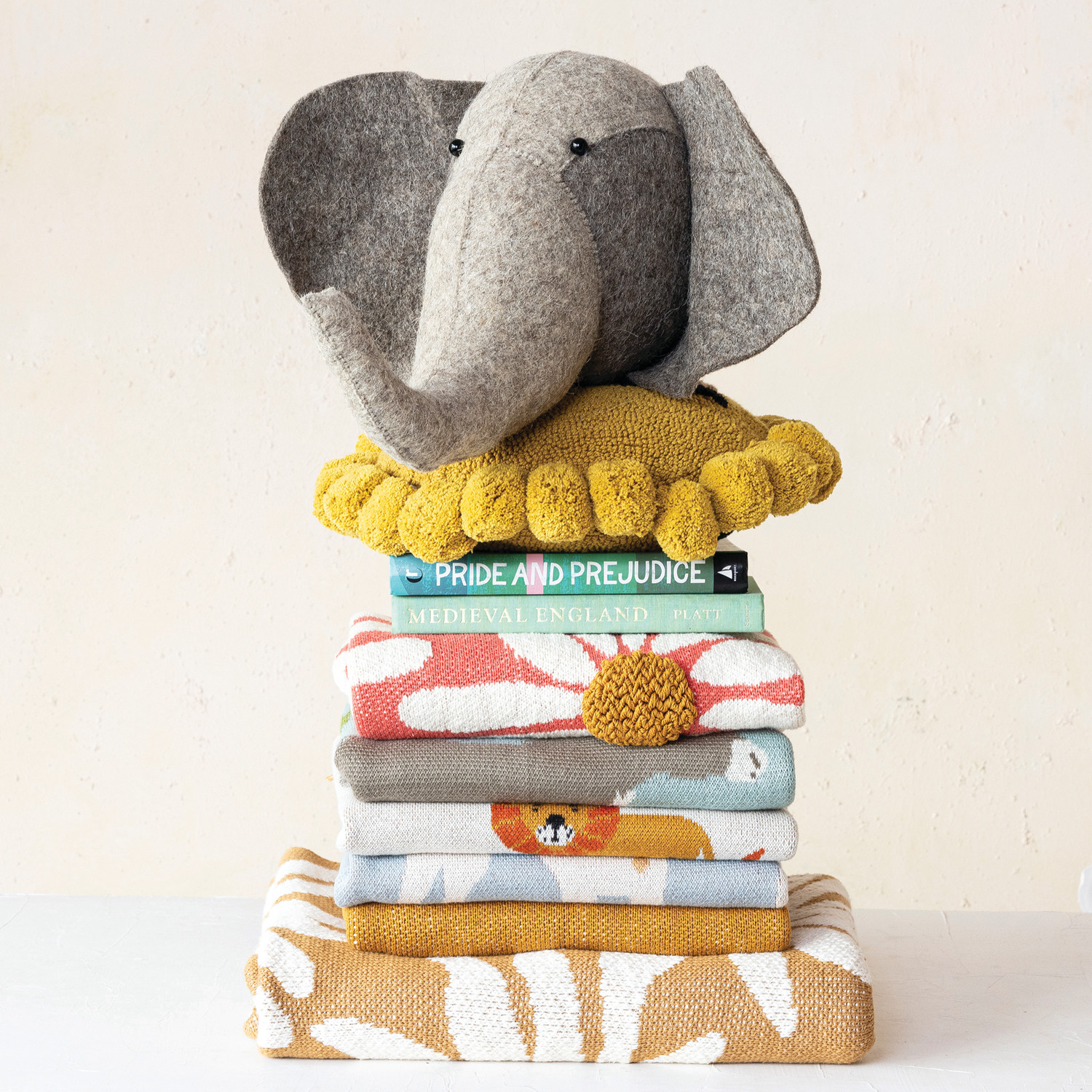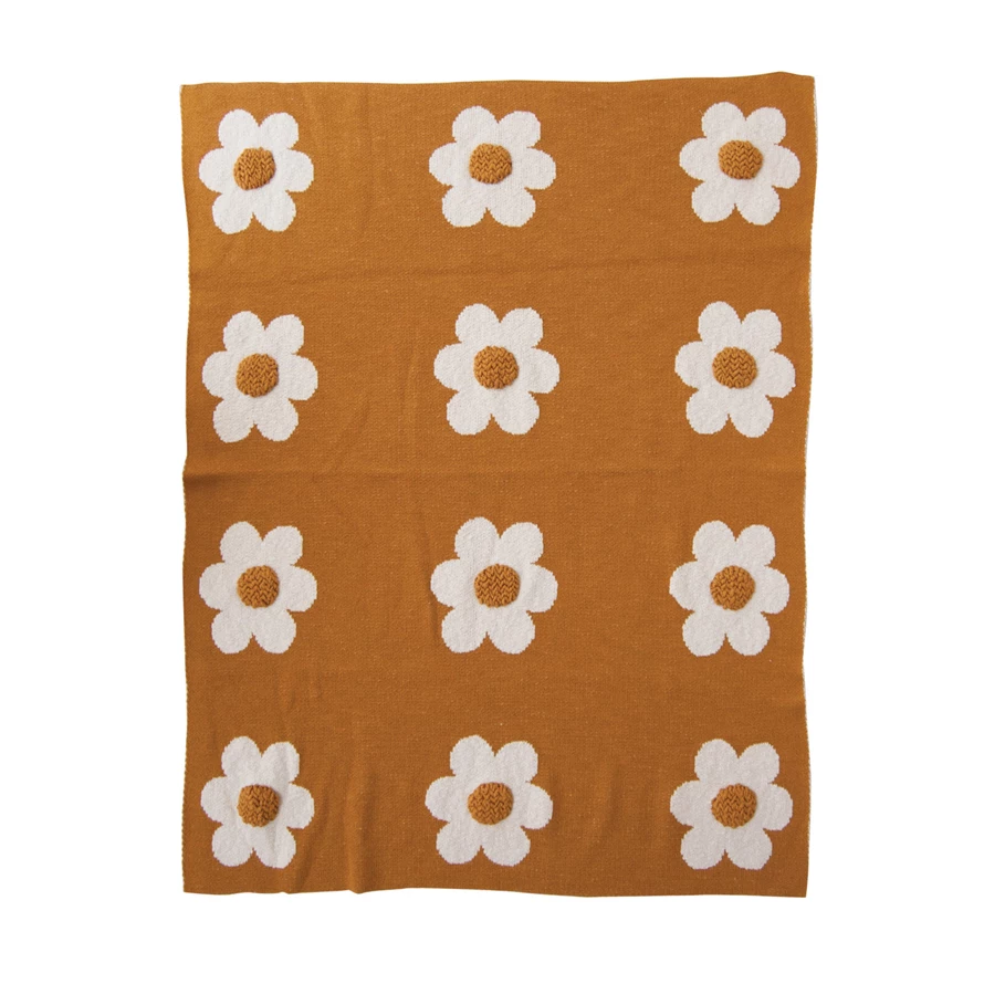 Catalog Name: 40"L x 32"W Cotton Knit Baby Blanket w/ Flowers & Tufting, Natural & Mustard Color
