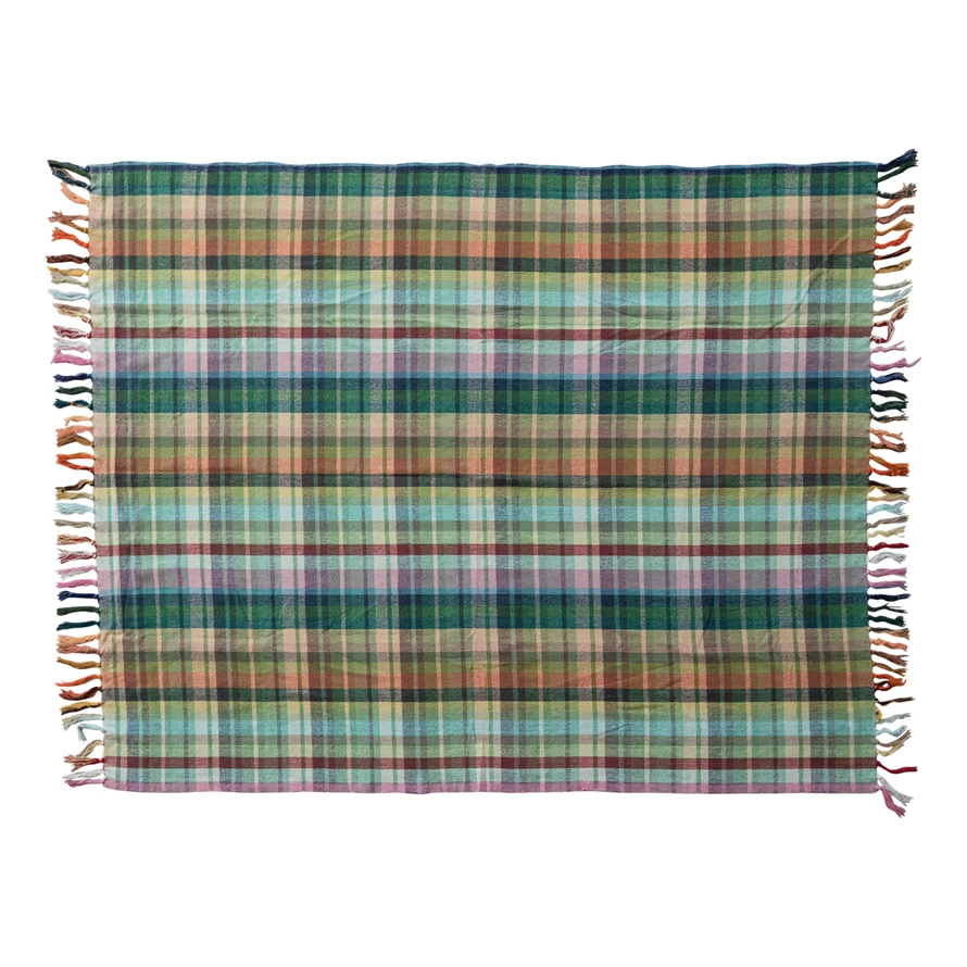 Catalog Name: 60"L x 50"W Woven Cotton Throw w/ Pattern & Fringe, Multi Color Plaid
