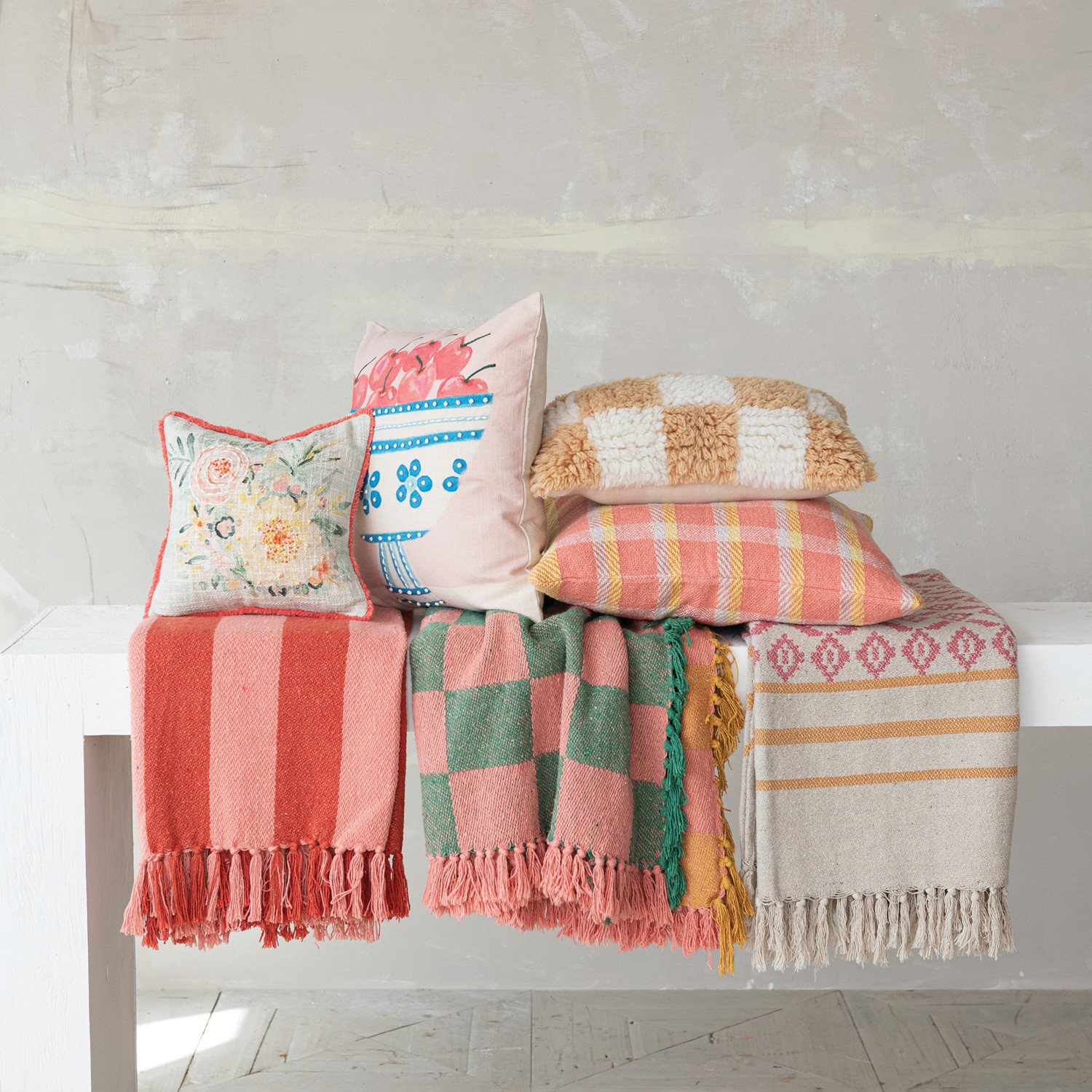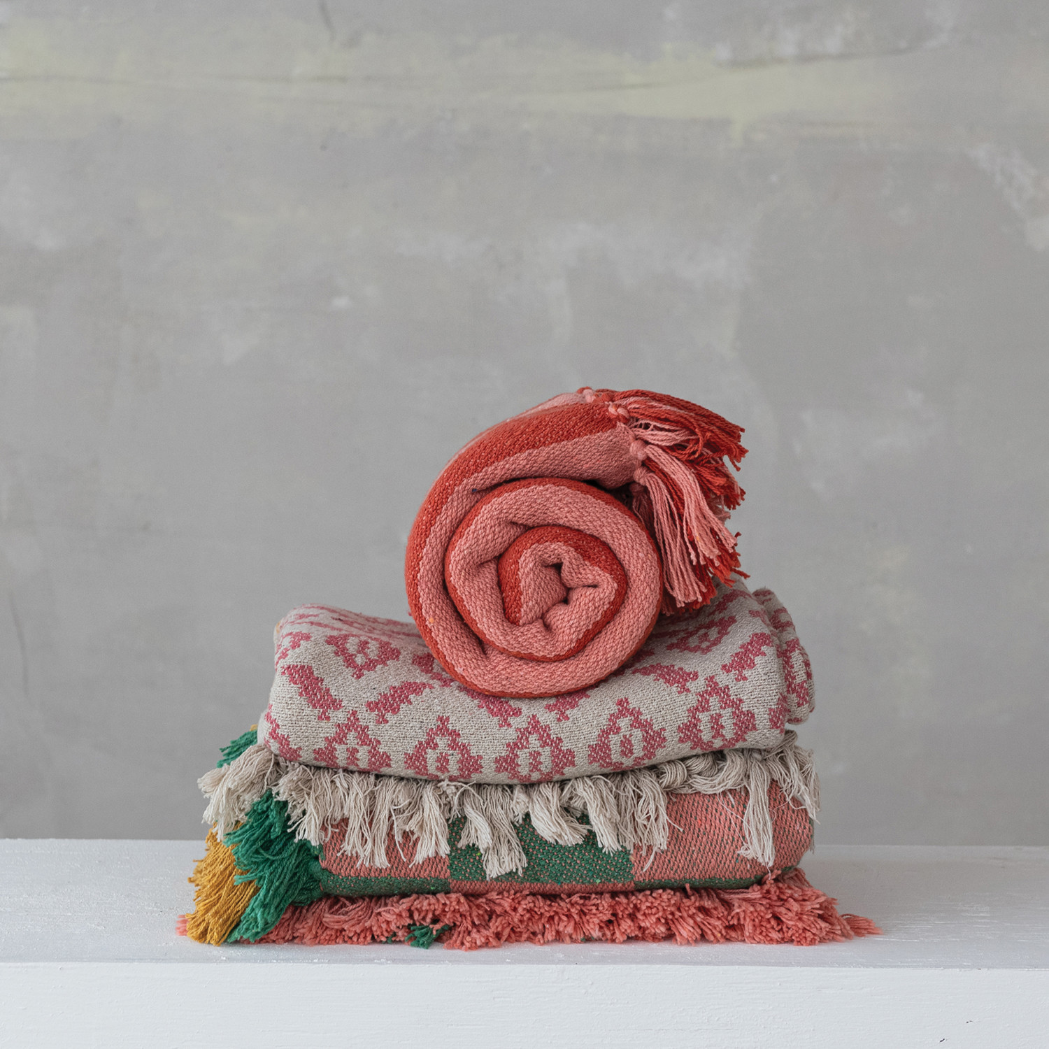 Catalog Name: 60"L x 50"W Woven Recycled Cotton Blend Throw w/ Stripes & Fringes, Red & Pink