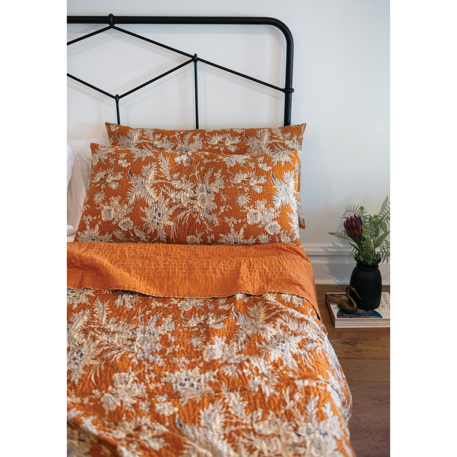 Catalog Name: 102"L x 90"W Cotton Voile Printed Bed Cover w/ Florals, Hand-Embroidered Kantha Stitch & 2 Standard Shams, Queen, Gold Color, Blue & White, Set of 3 Tied w/ Cotton Tape