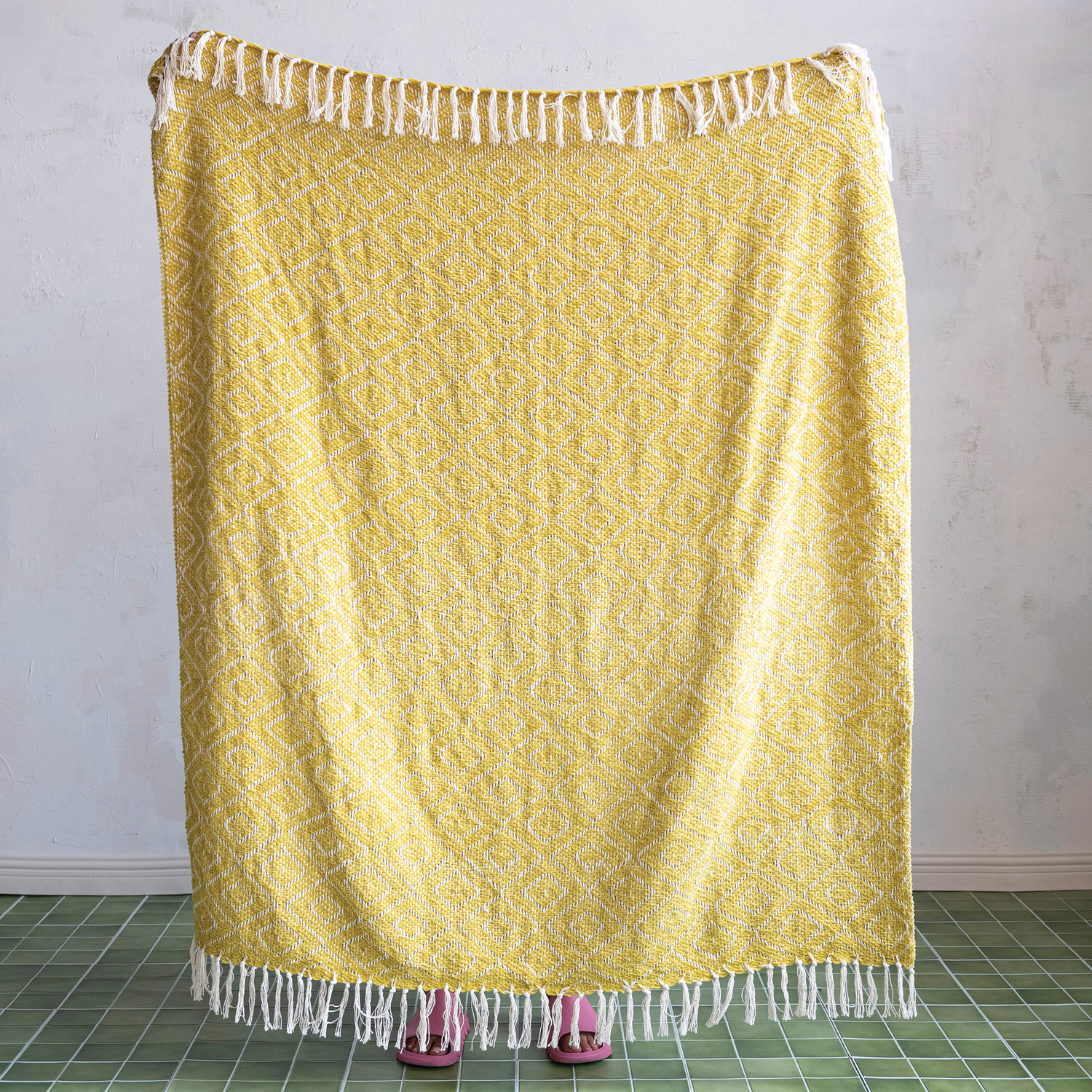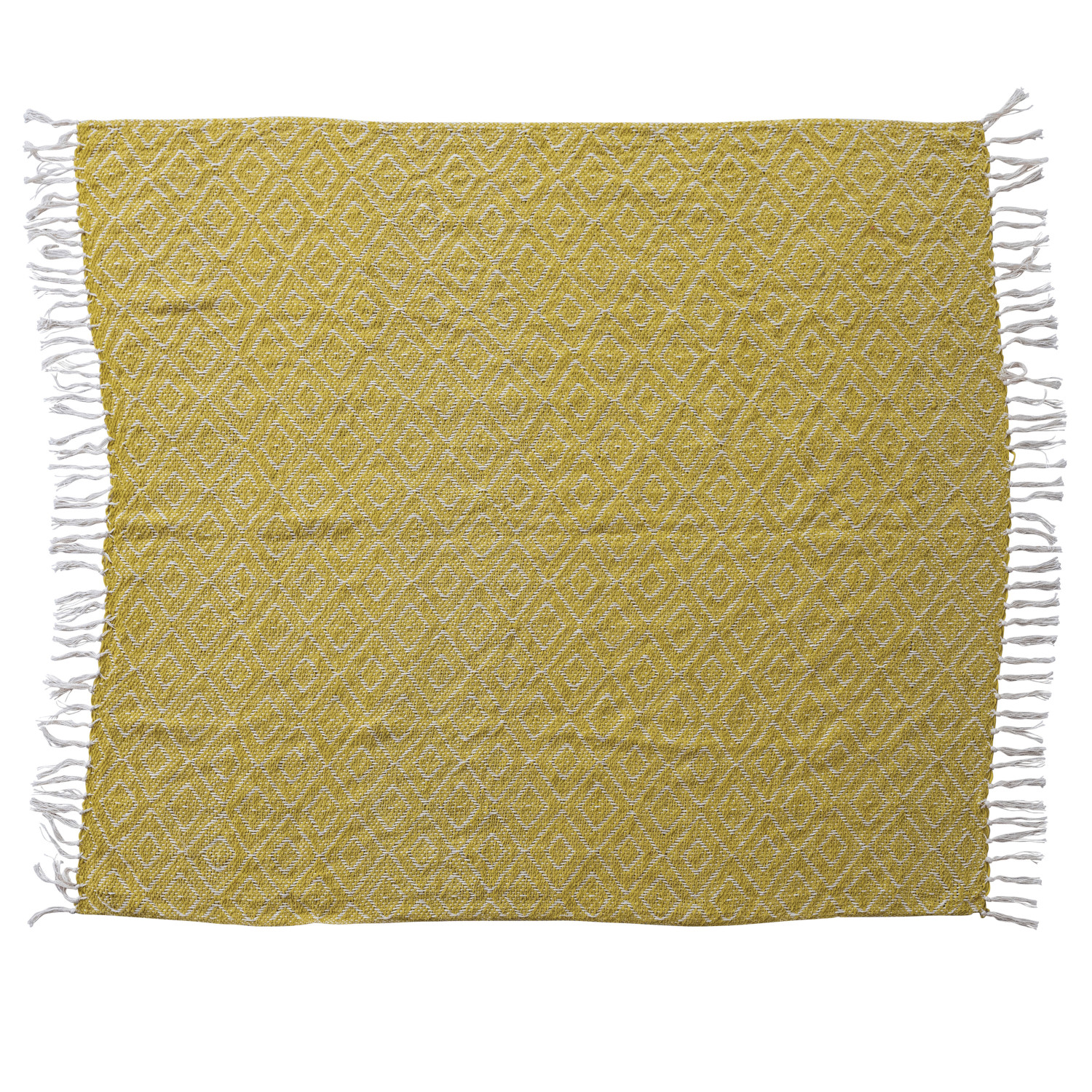 Catalog Name: 60"L x 50"W Woven Fabric Chenille Throw w/ Diamond Pattern & Fringe, Chartreuse & Cream Color