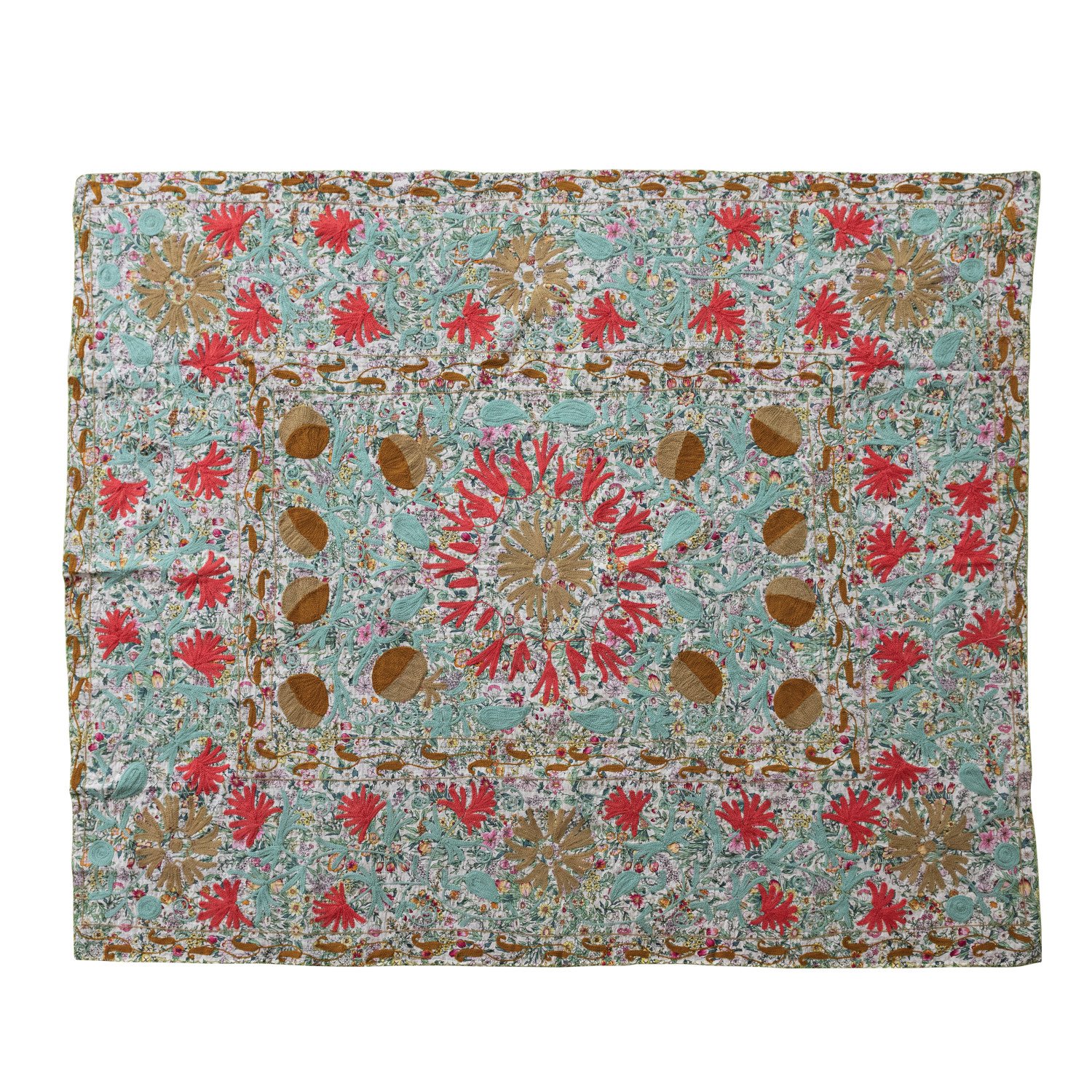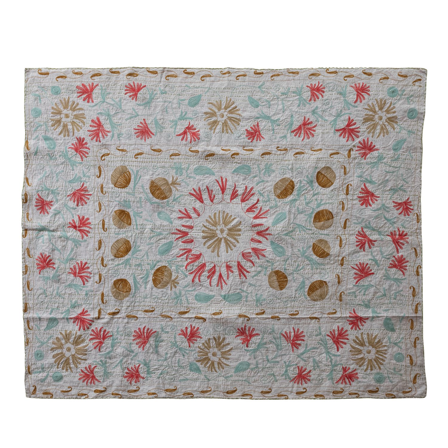Catalog Name: 60"L x 50"W Stonewashed Cotton Voile Printed Two-Sided Throw w/ Suzani Pattern & Hand-Embroidered Kantha Stitch, Multi Color