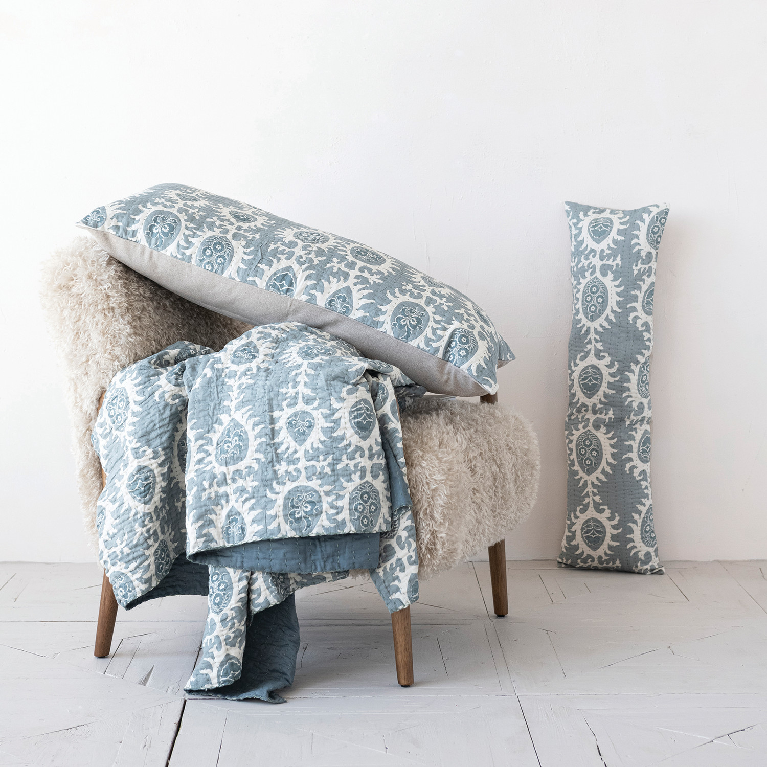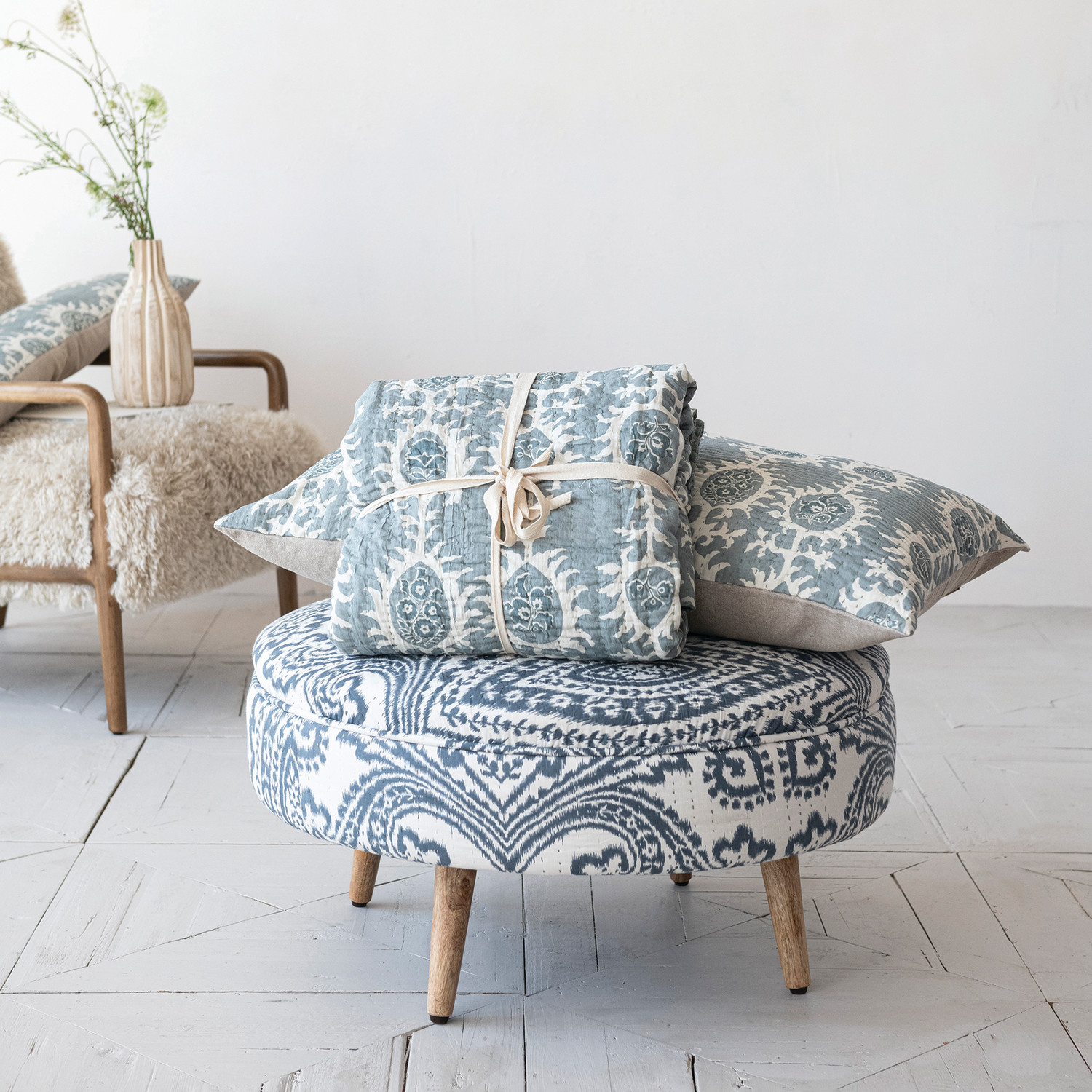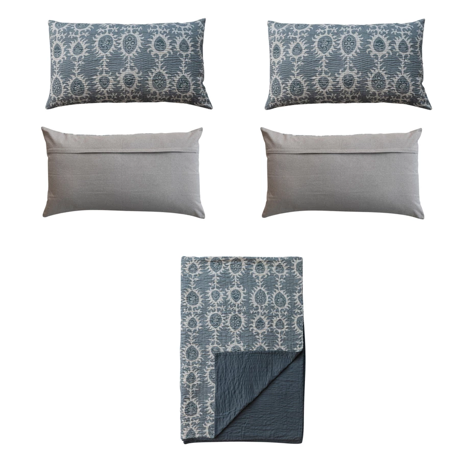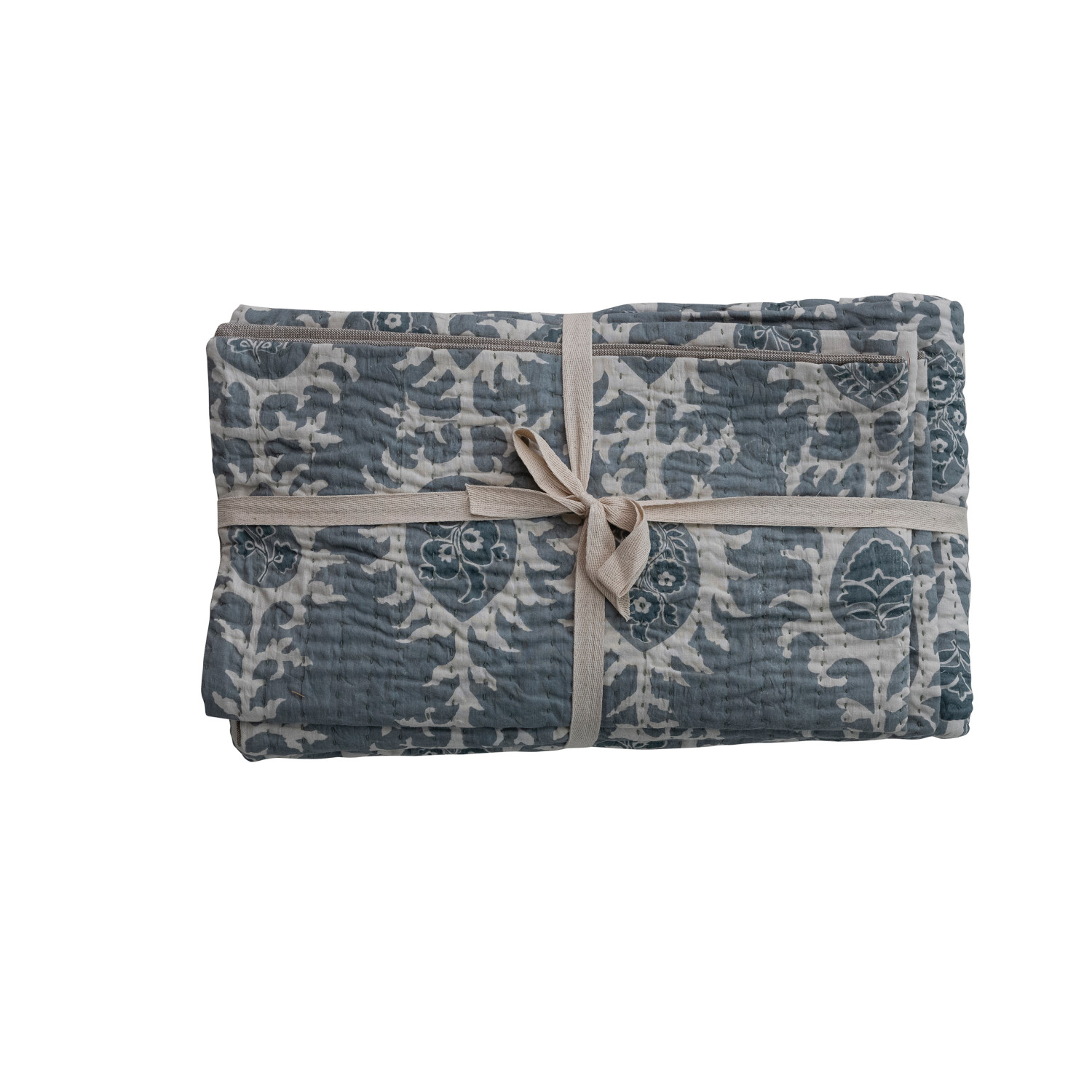 Catalog Name: 102"L x 90"W Cotton Voile Printed Bed Cover w/ Pattern, Hand-Embroidered Kantha Stitch & 2 Standard Shams, Queen, Blue & White, Set of 3 Tied w/ Cotton Tape