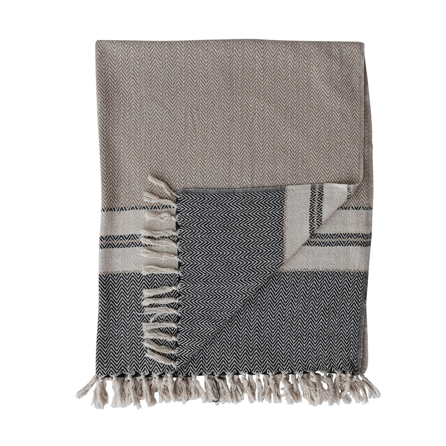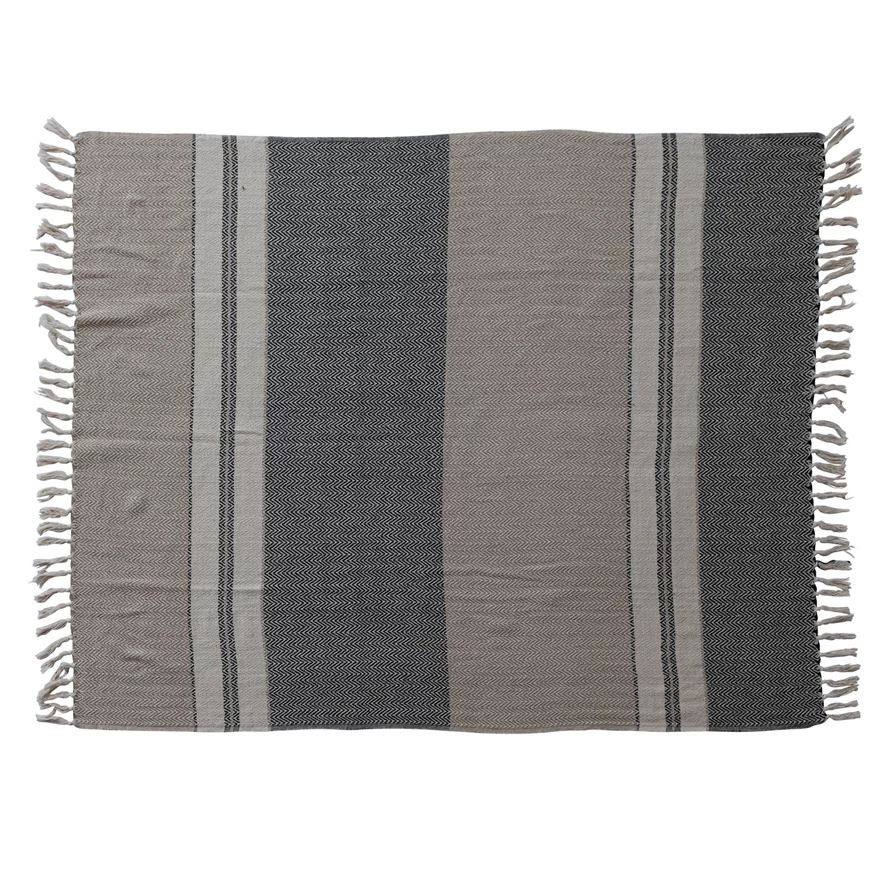 60"L x 50"W Woven Recycled Cotton Striped Throw with Fringe, Beige, Grey & Cream Color