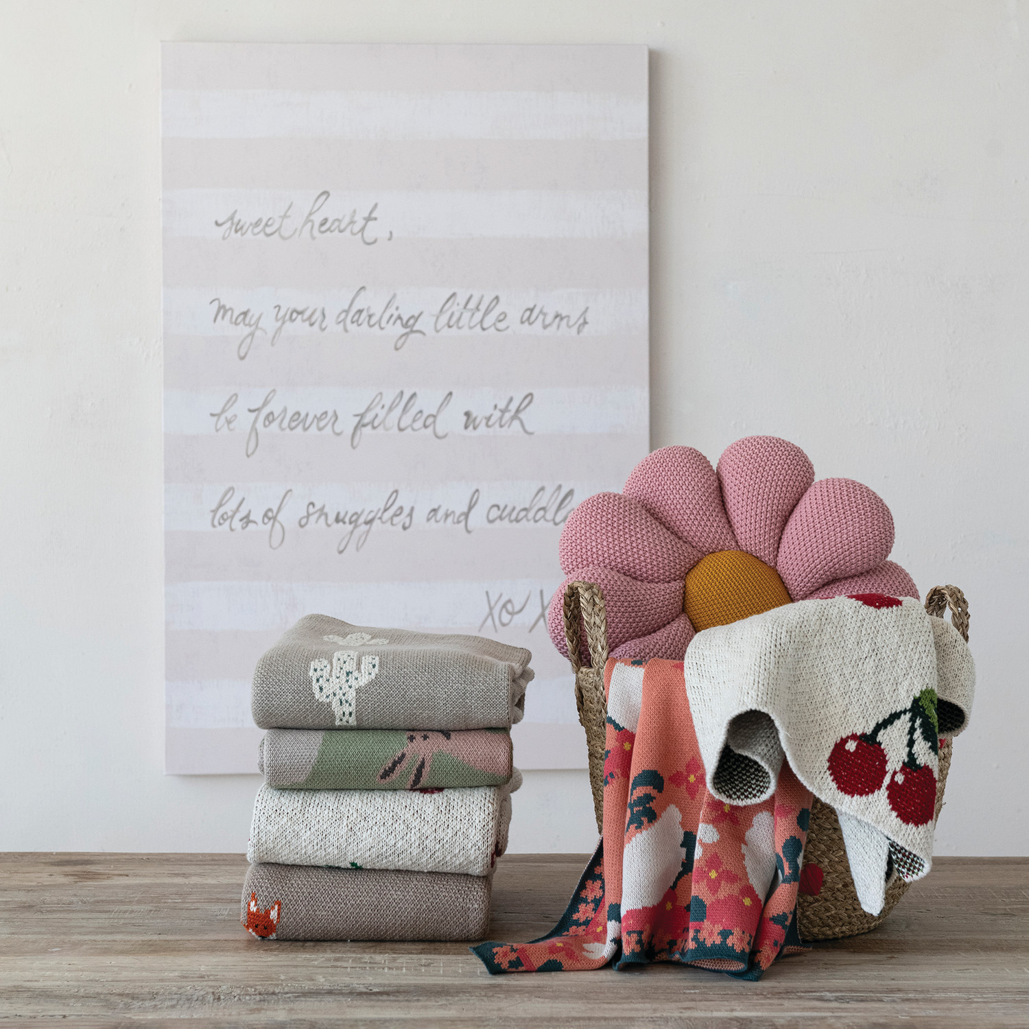 Cotton Knit Baby Blanket with Strawberries, Cream Color, Red & Green