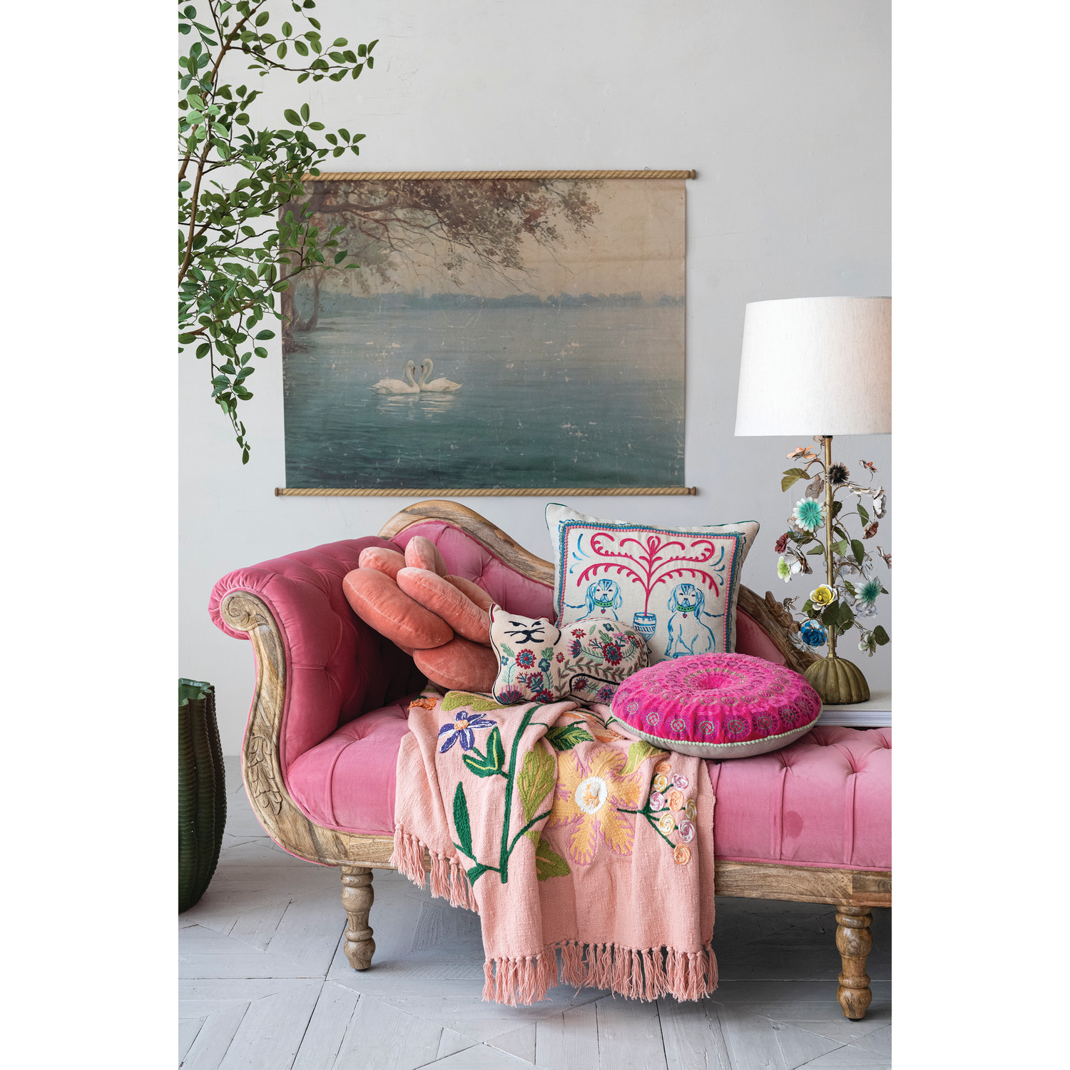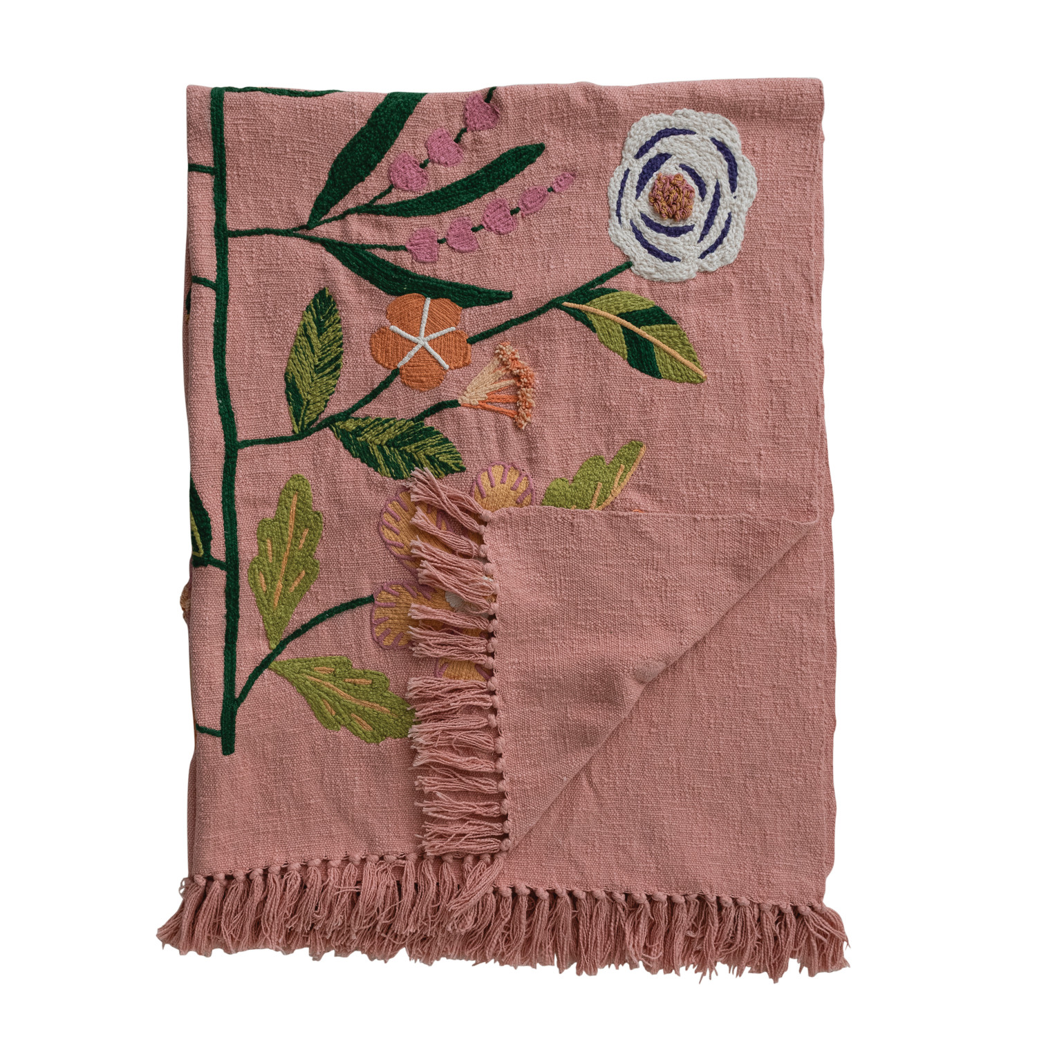 60"L x 50"W Woven Cotton Throw with Embroidered Flowers & Fringe