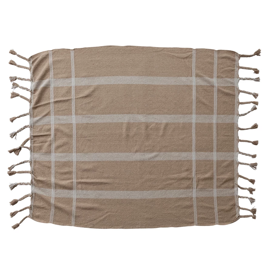 60"L x 50"W Woven Recycled Cotton Blend Striped Throw with Braided Fringe, Beige & Natural