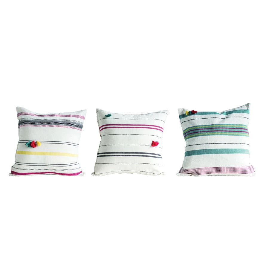 Catalog Name: 16" Square Hand-Woven Cotton Striped Pillow w/ Tassels, Multi Color, 3 Styles