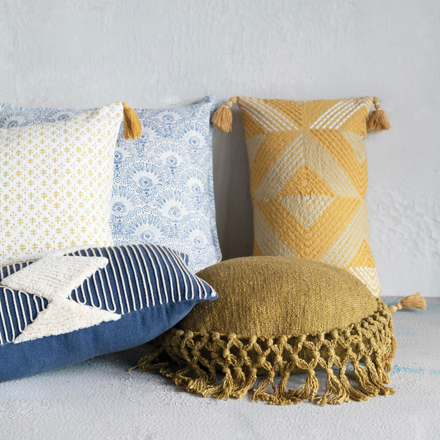 Catalog Name: 20" Square Cotton Pillow w/ Pattern & Tassels, Cream & Mustard Color