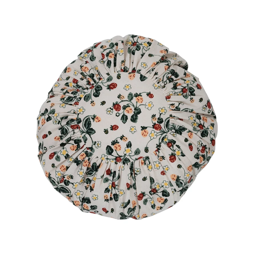 Catalog Name: 16" Round Cotton Pleated Pillow w/ Strawberry Floral Pattern, Multi Color ©