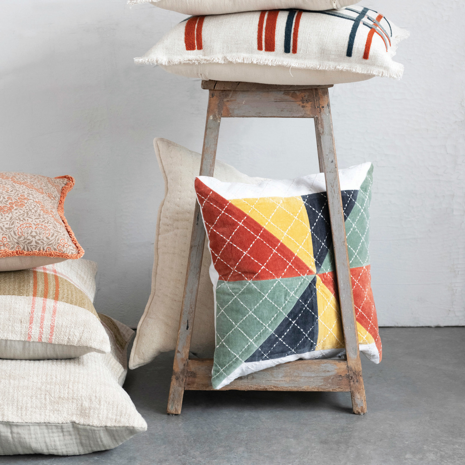 This statement-making throw pillow cover showcases multicolor patchwork velvet, masterfully crafted with a kantha stitch. Multicolor square velvet patchwork throw pillow with kantha stitch. Express your constantly evolving style with the simple addition of this eye-catching pillow. Removable cotton pillow cover with polyester insert; Back zipper with hidden flap; Machine wash cold, gentle cycle; Do not bleach, warm iron if needed.