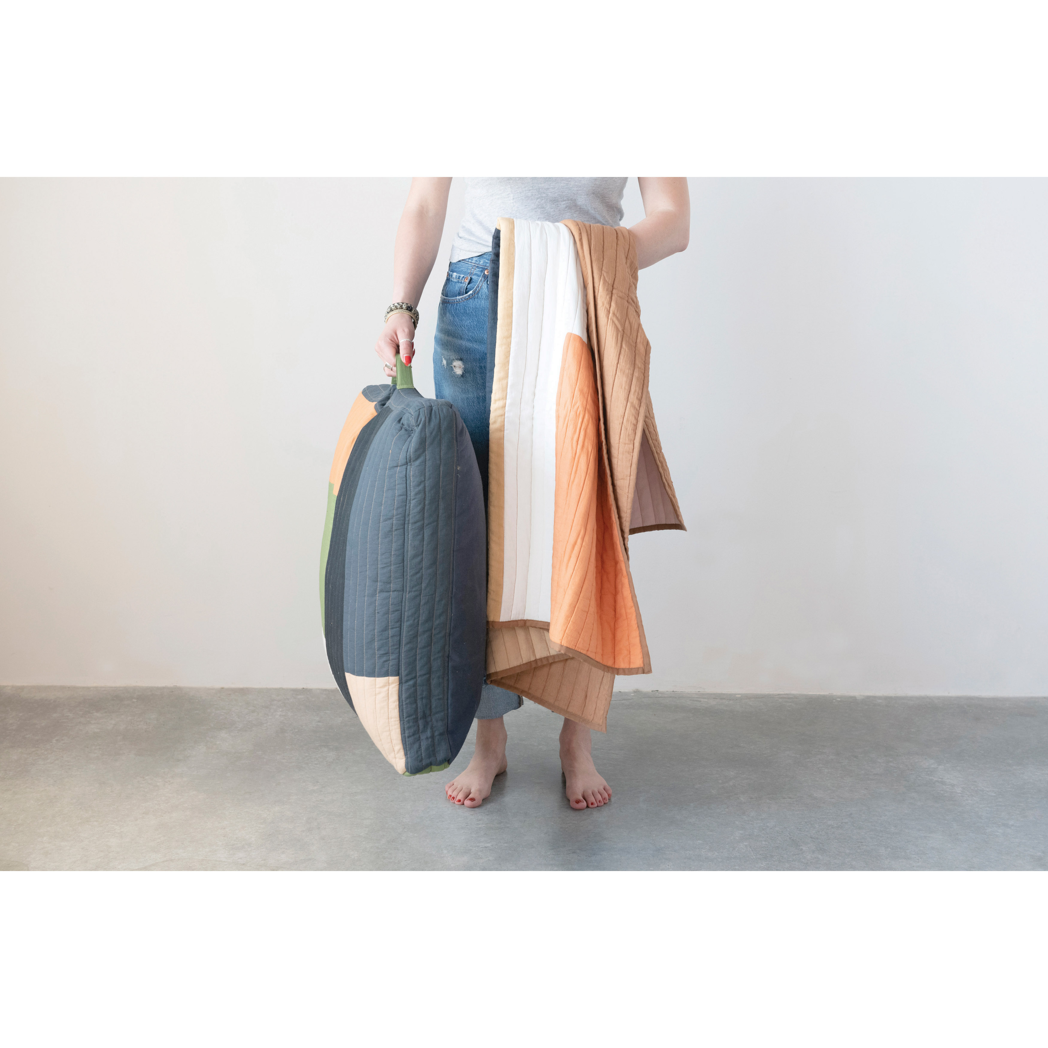 This cheerful cotton pouf features multicolor quilted patchwork and a stylishly functional handle. Multicolor quilted cotton patchwork pouf with handle; Tonal cotton encasement on bottom. Express your constantly evolving style with the simple addition of this eye-catching pouf. Cotton pouf; Spot clean only.