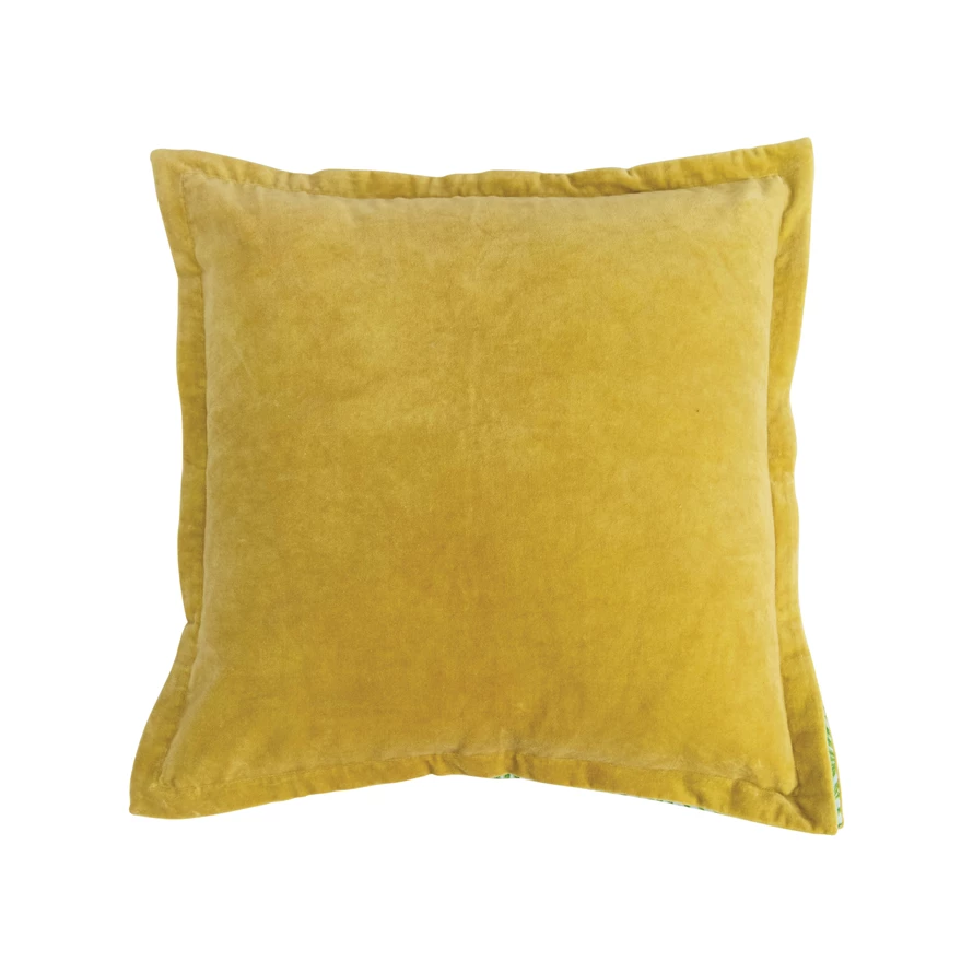 This sophisticated, subtly tropical throw pillow features luxurious cotton velvet construction with a peek-a-boo palm print gusset. Square chartreuse cotton velvet throw pillow with green palm print gusset. Express your constantly evolving style with the simple addition of this eye-catching pillow. Cotton velvet throw pillow; Spot clean only.