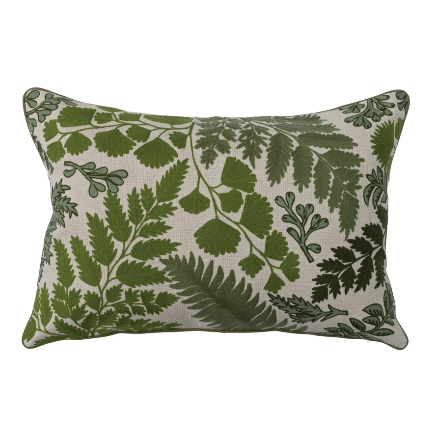 A beautiful and cozy lumbar pillow with a cotton cover, featuring green embroidered botanical prints on a natural background. Polyester fill insert included.