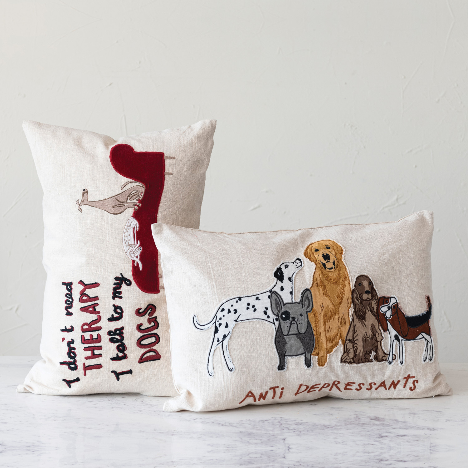 Our thoughtfully curated collection of throw pillows showcases a wide array of lush woven textures, prints, embroidery, and silhouettes to create the picture-perfect nook. Explore a variety of plush accents to transform a house into a home including throw pillows, lumbar pillows, bolster pillows, down and polyfill inserts, and so much more. Choose from a vast array of materials from supple velvet and handwoven cotton to embroidered wool and textural boucle, and styles from mid-century modern and classic farmhouse to contemporary boho and vintage glam. Add a dash of relaxation and sophistication to a lounge space or bedroom to curate a warm and welcoming ambiance that is guaranteed to impress. This whimsical throw pillow features intricately embroidered dogs on durable cotton and a playful "I don't need therapy, I talk to my dogs" message. Includes polyfill insert. Machine Wash Warm Gentle Cycle, Do Not Bleach, Tumble Dry Low, Warm Iron If Needed or Hand Wash. Made from cotton and polyester.