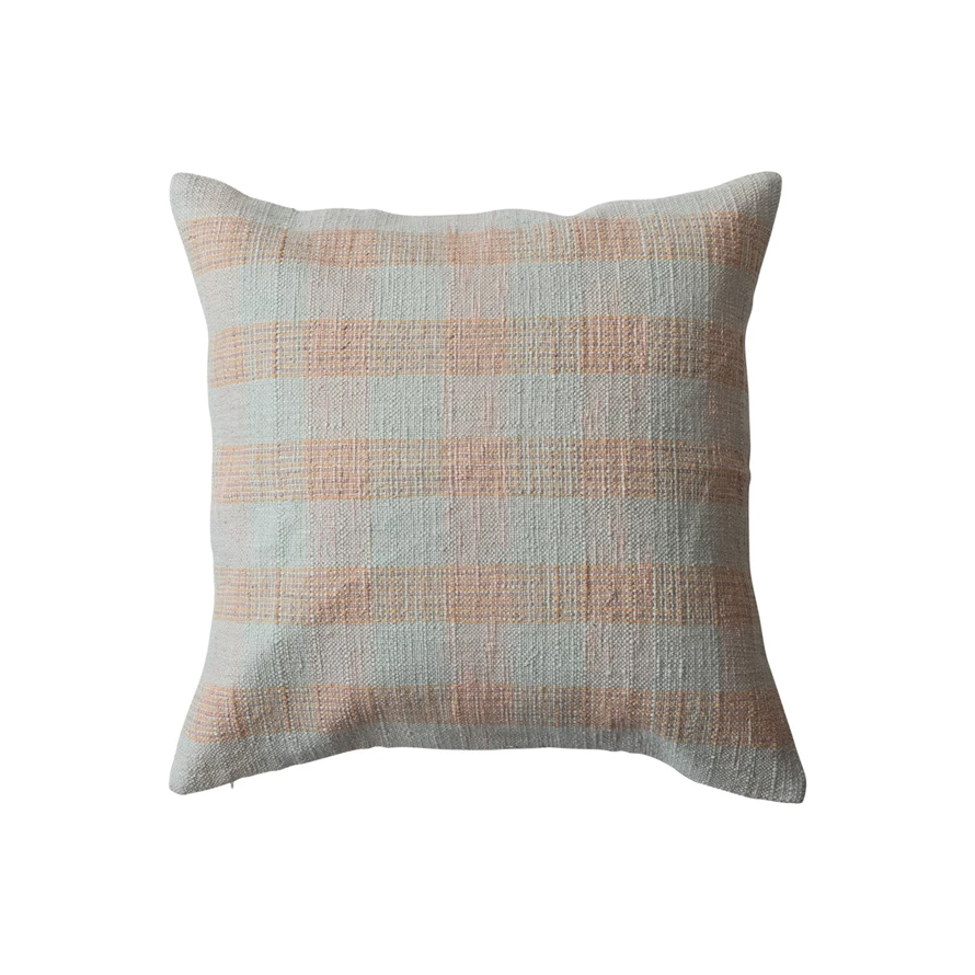 Catalog Name: 20" Square Hand-Woven Cotton Pillow, Mint Color, Pink & Tan Color Plaid