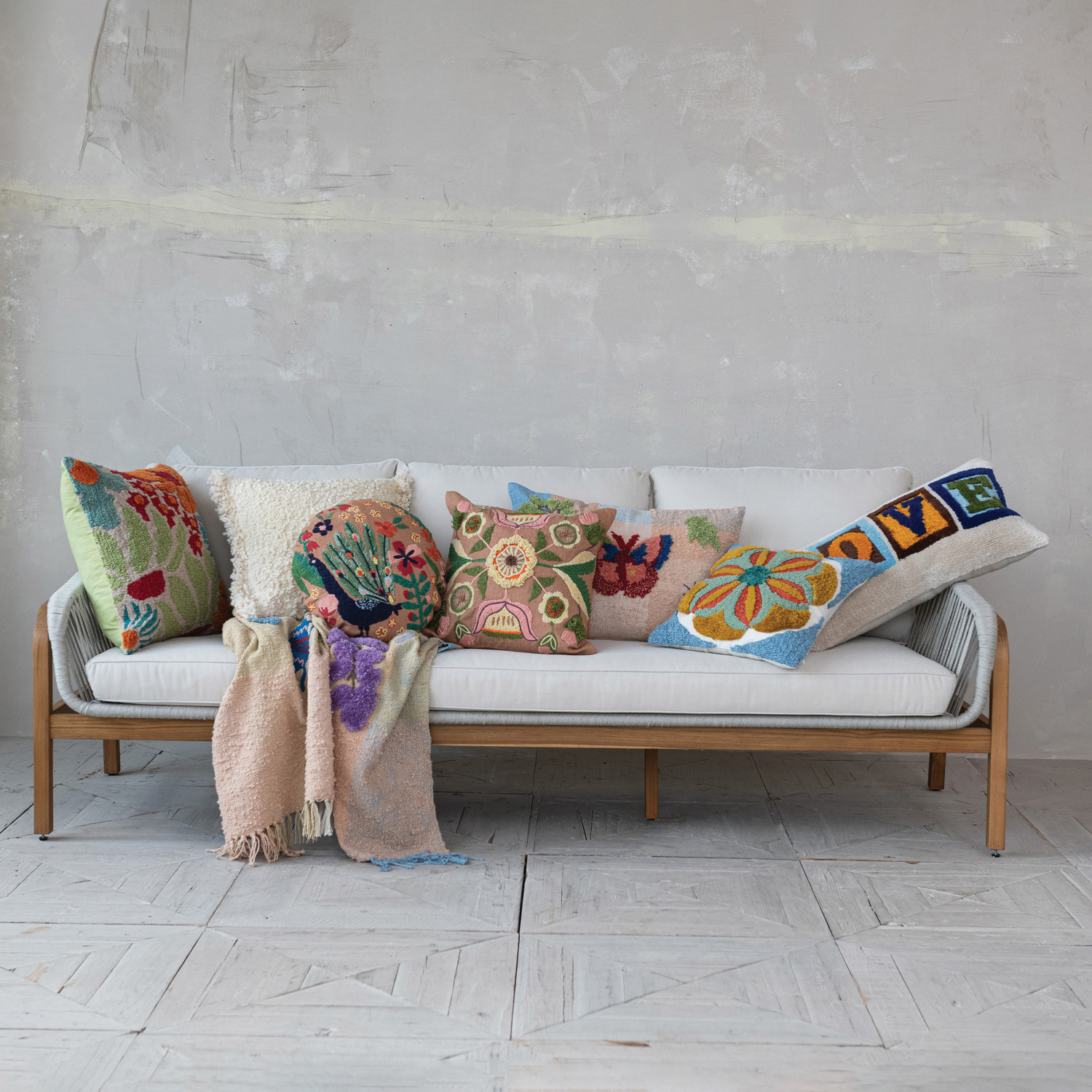 Woven Fabric Indoor/Outdoor Lumbar Pillow with Tufting & Embroidery