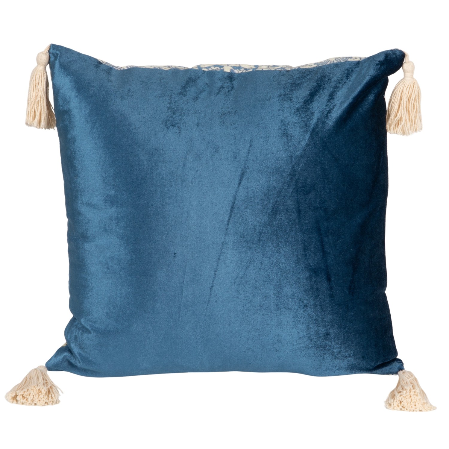 Catalog Name: 18" Square Cotton Velvet Printed Pillow w/ Vintage Carpet Pattern & Tassels, Blue & Cream Color
