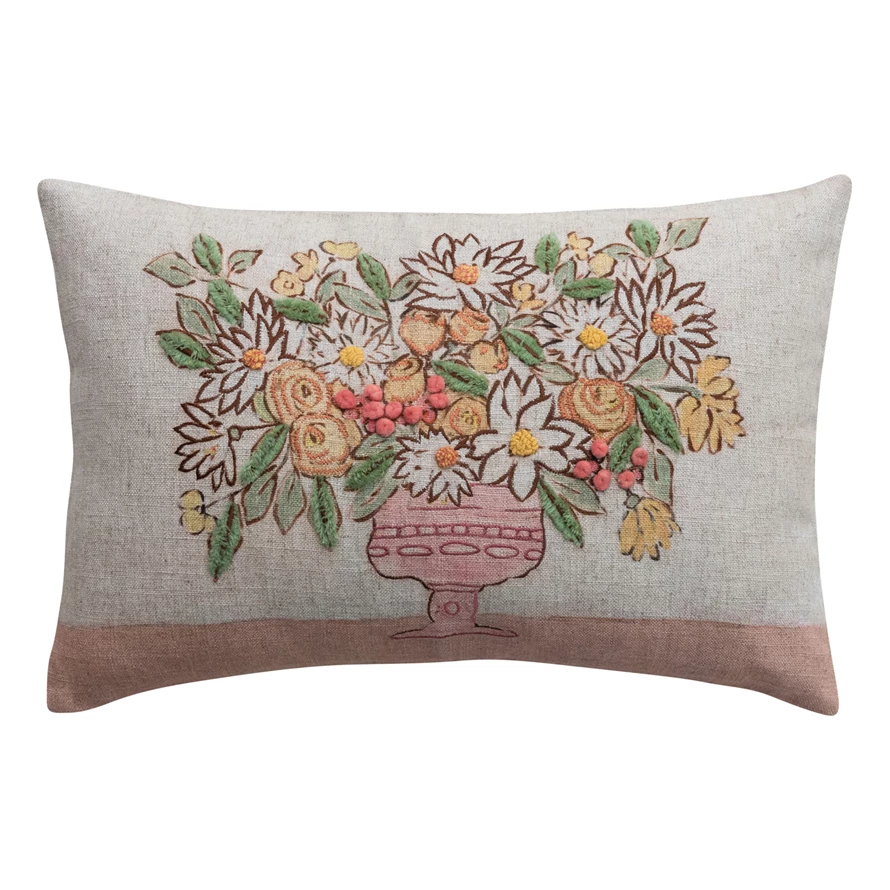 Linen Blend Printed Lumbar Pillow w/ Flowers in Vase, Embroidery, Pom Poms & Chambray Back ©