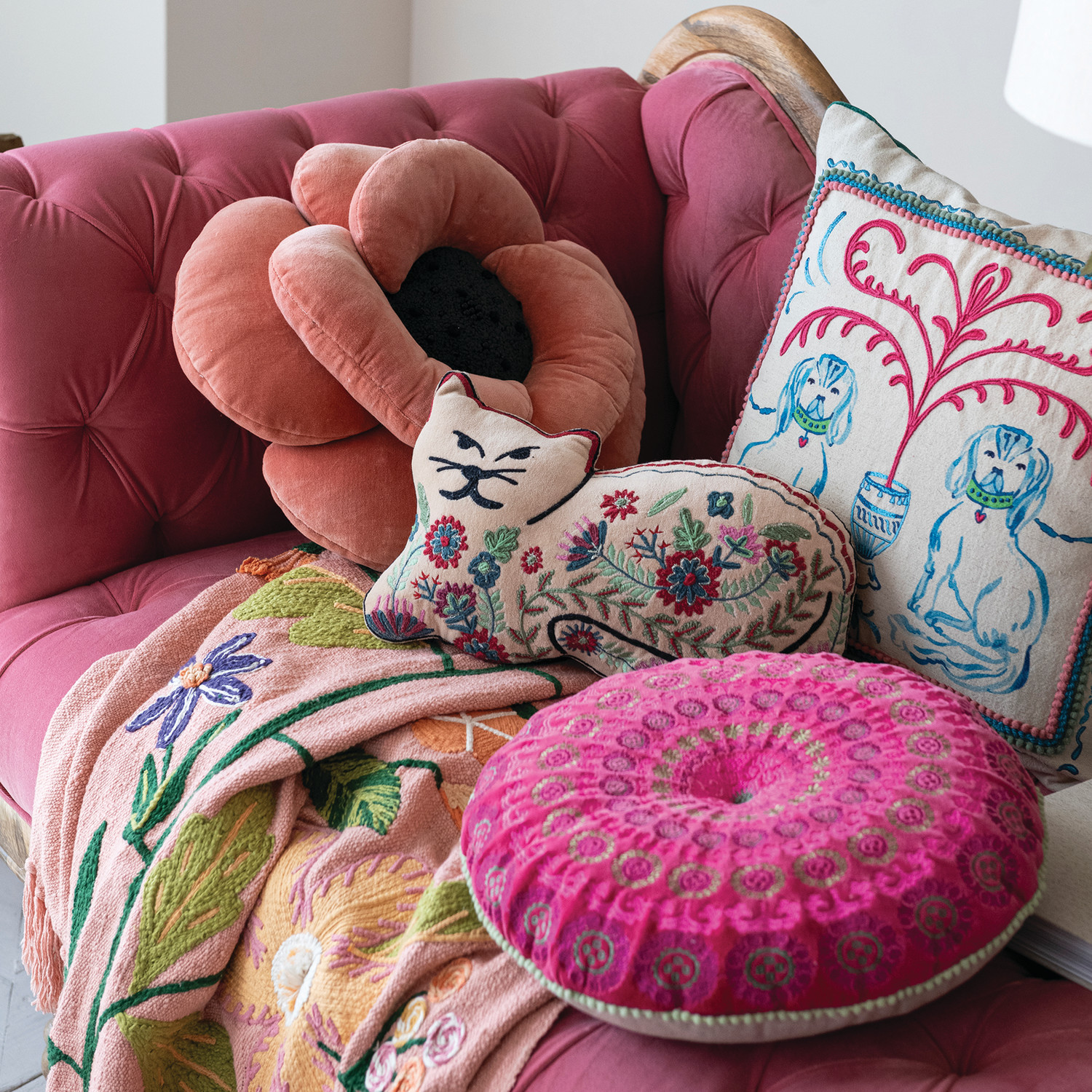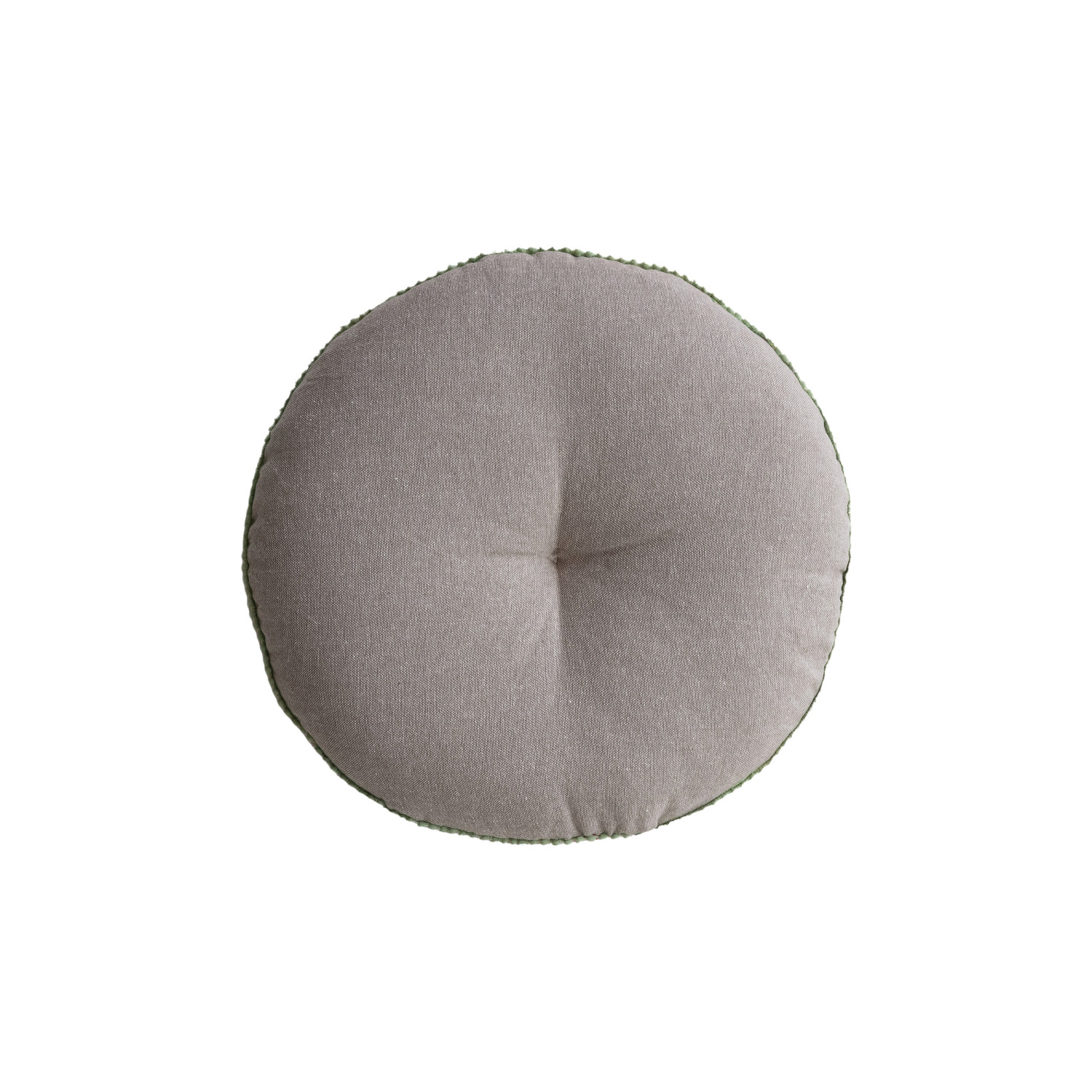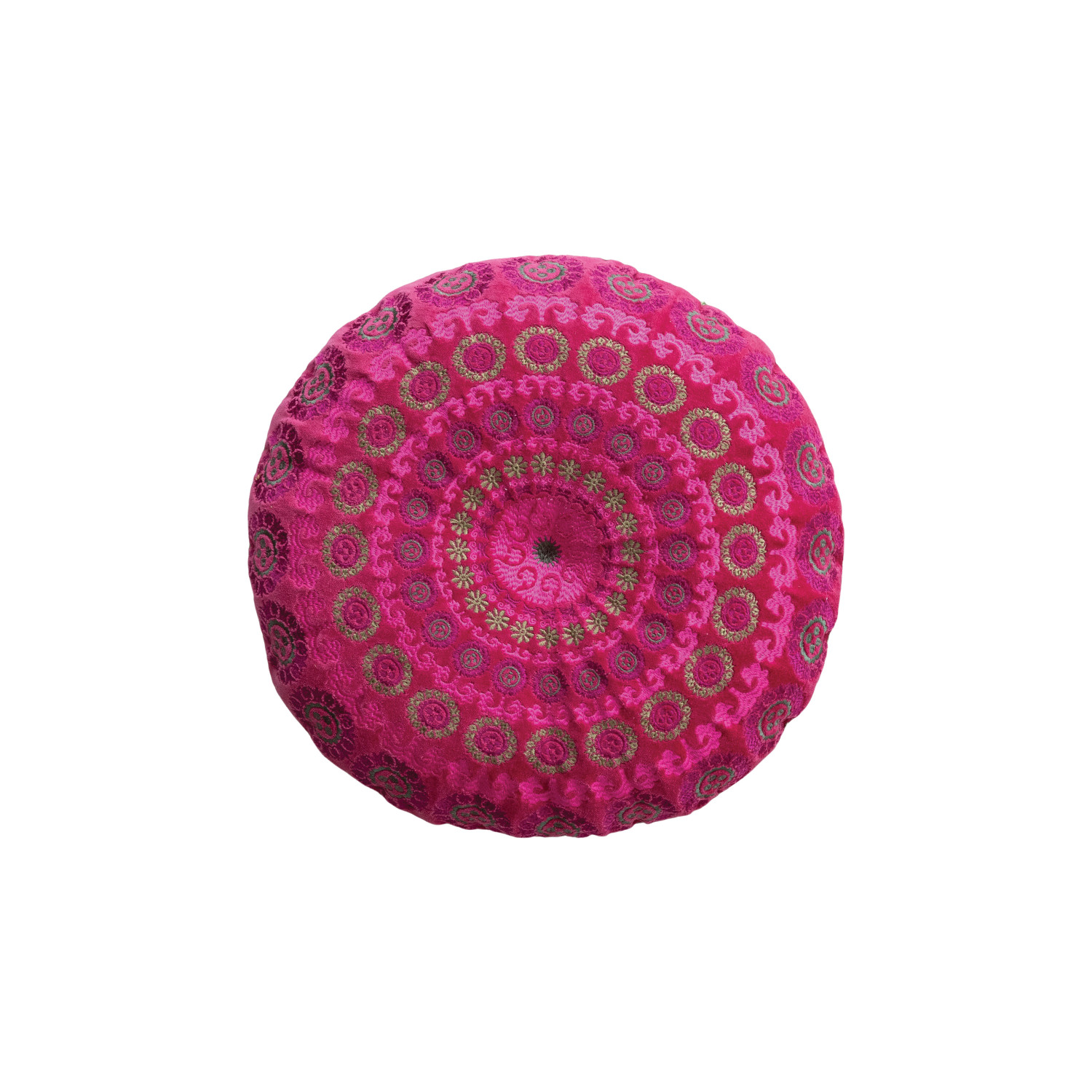 Catalog Name: 16" Round Cotton Velvet Embroidered Pillow w/ Mini Pom Pom Trim & Chambray Back, Multi Color