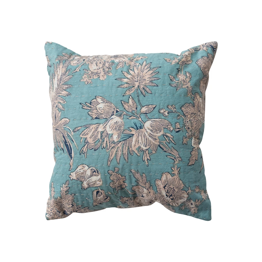 Catalog Name: 12" Square Cotton Voile Printed Pillow w/ Florals, Hand-Embroidered Kantha Stitch & Chambray Back, Blue & White
