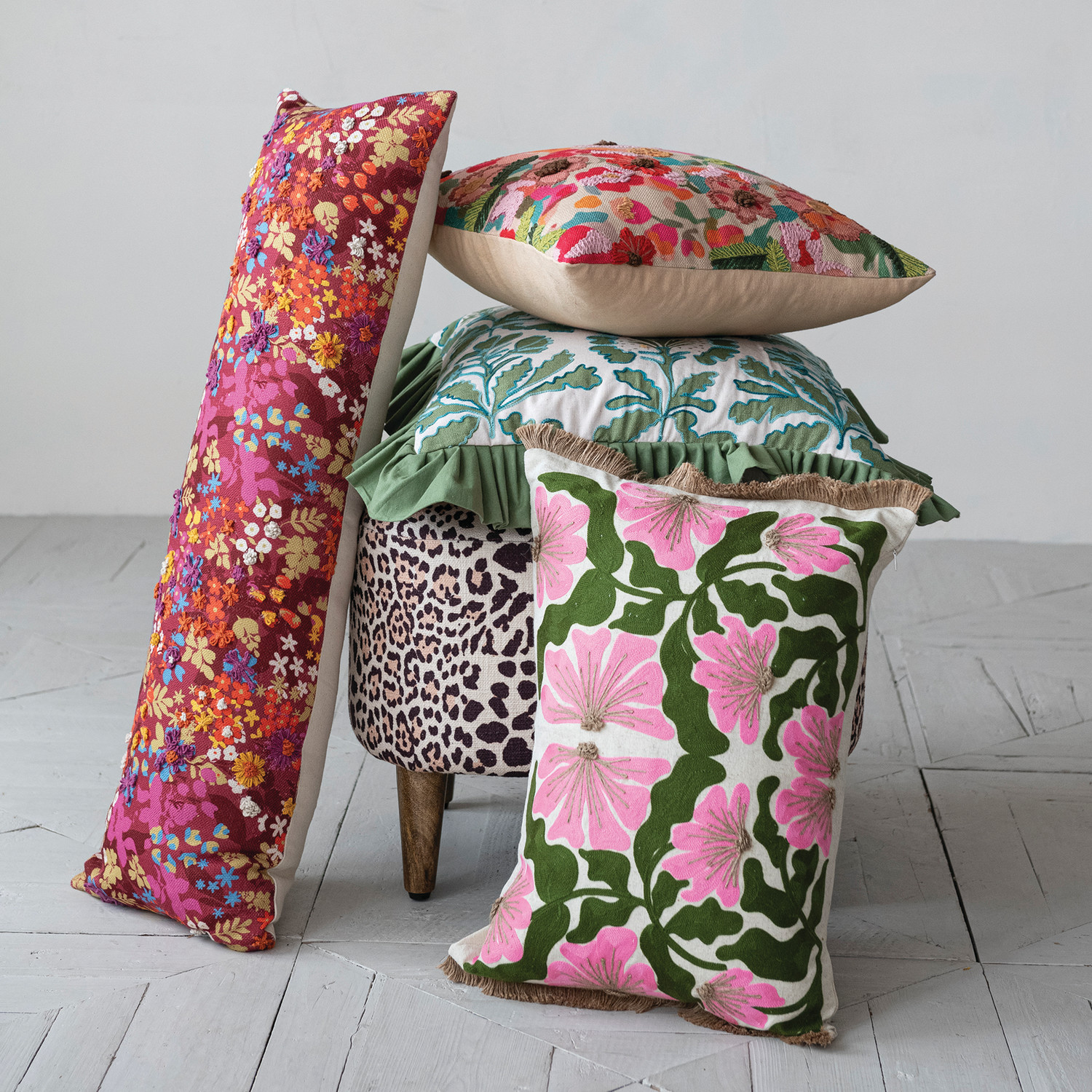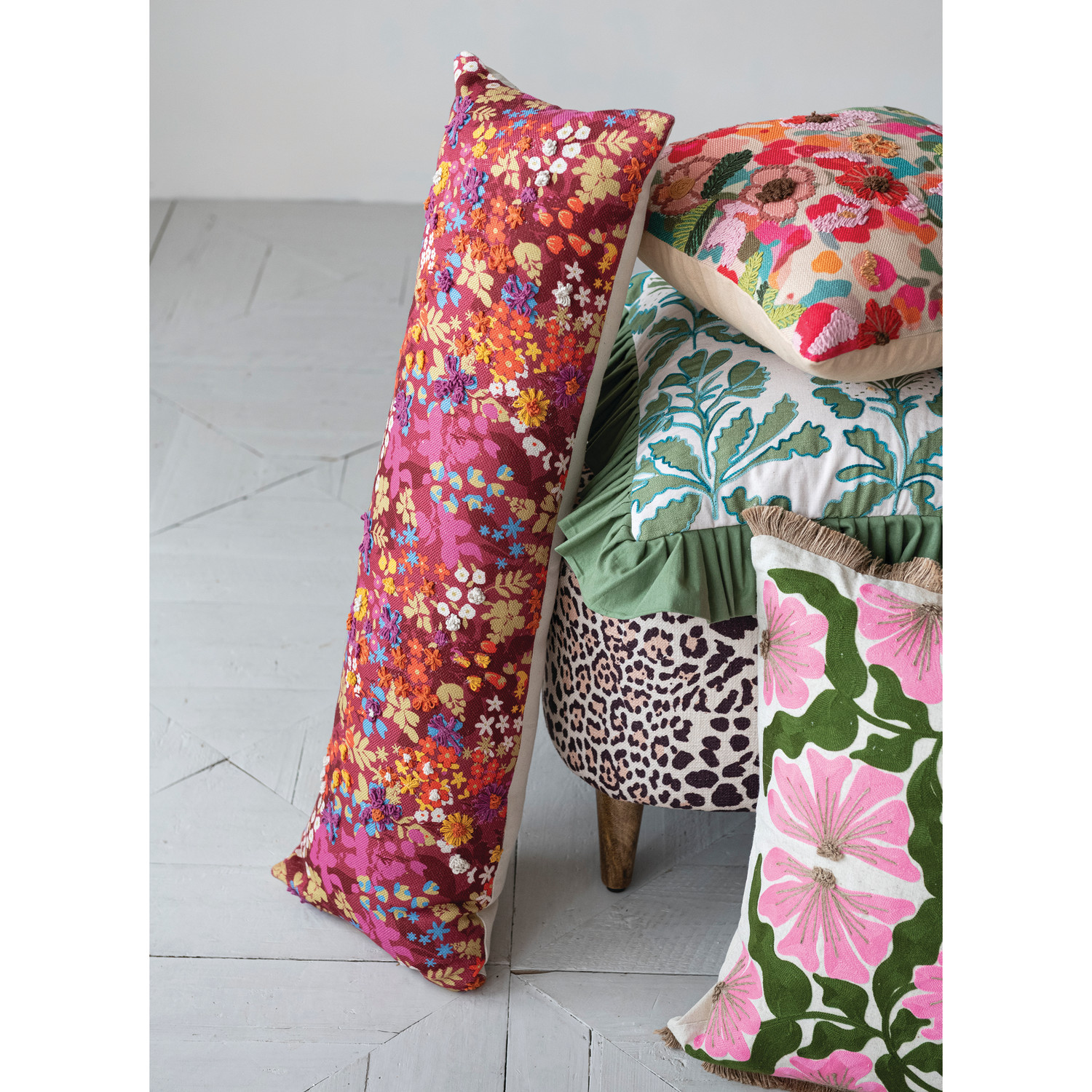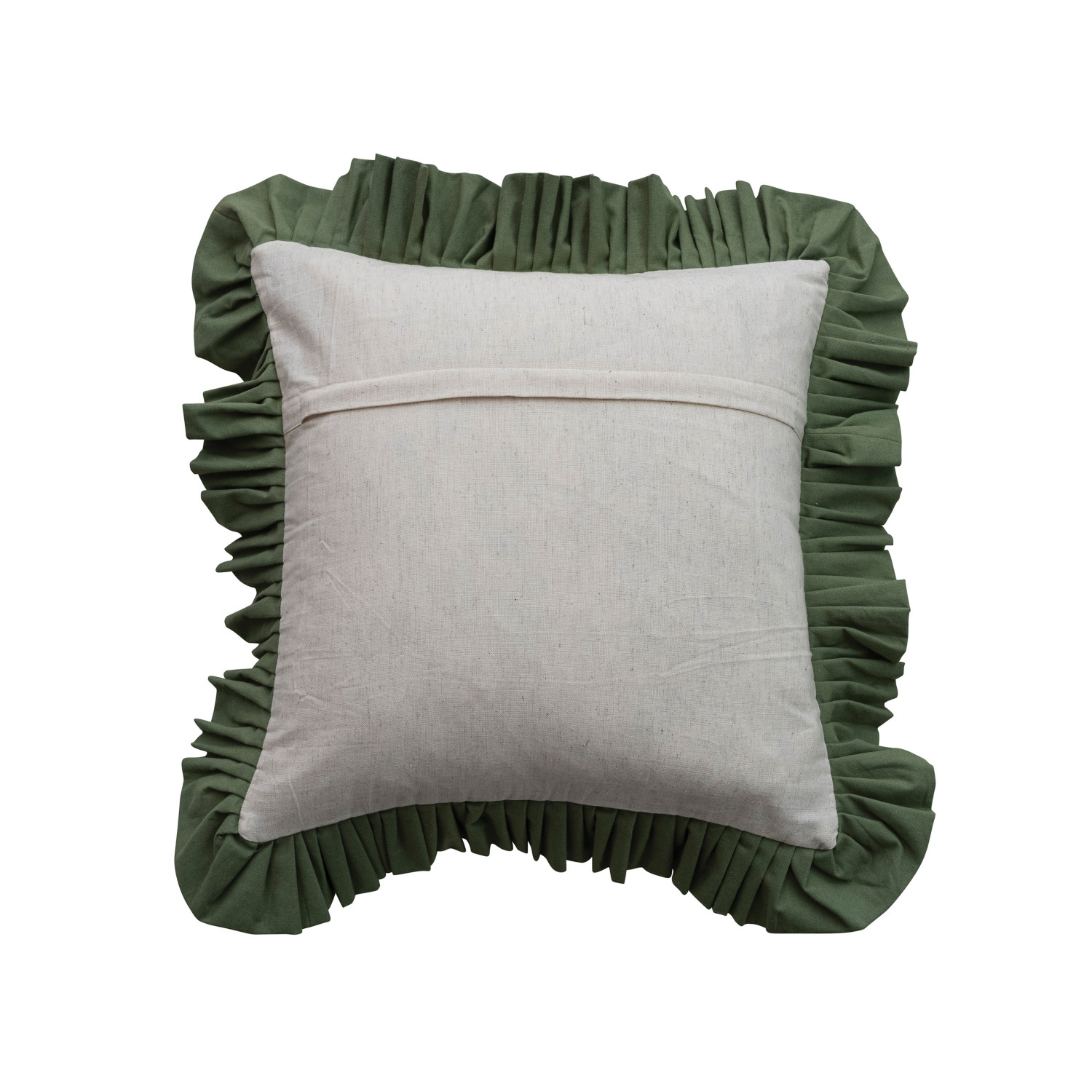 18" Square Cotton Pillow with Floral Pattern, Embroidery & Ruffle