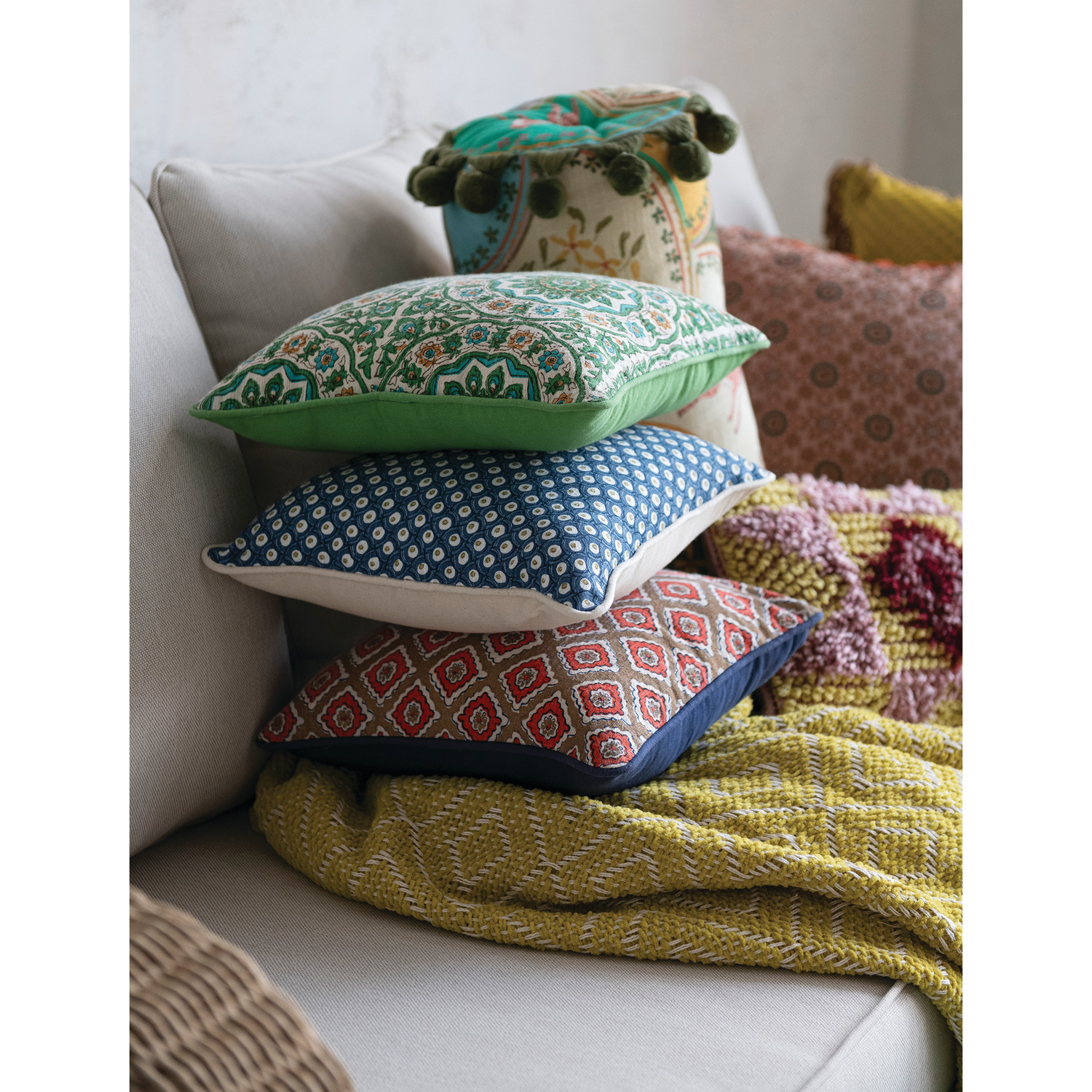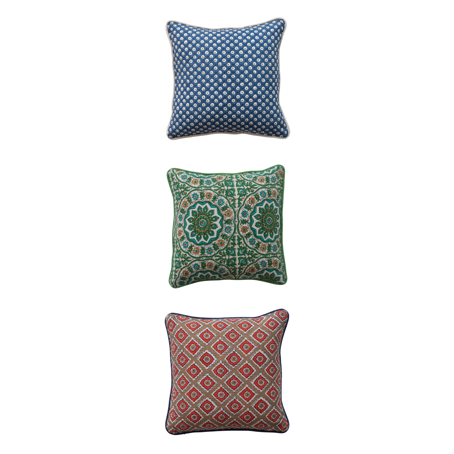 Catalog Name: 12" Square Cotton Slub Printed Pillow w/ Block Print Pattern & Piping, Multi Color, 3 Styles