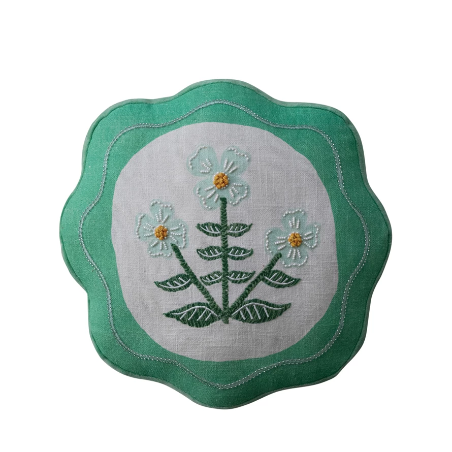 13-1/2" Round Cotton Scalloped Pillow with Embroidery & Velvet Back ©