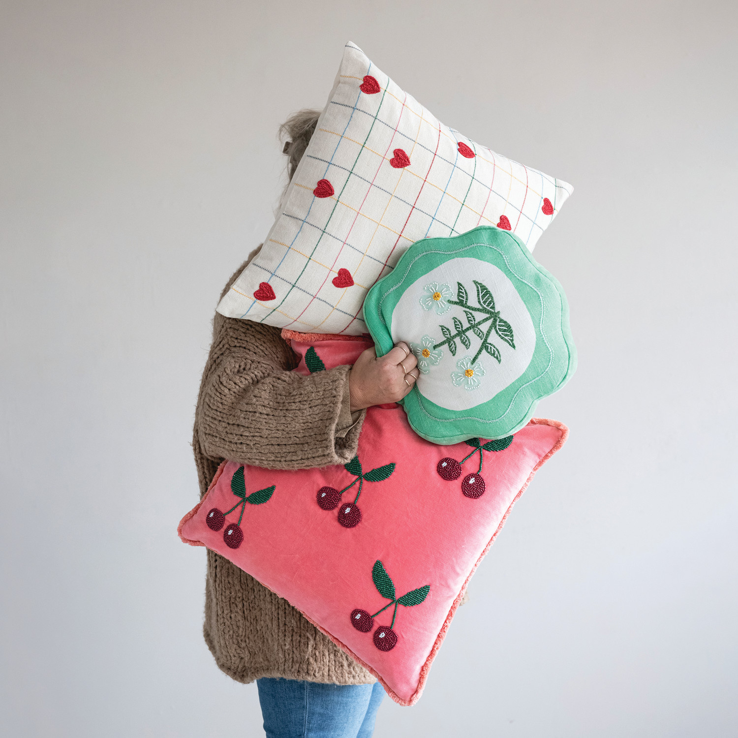 Catalog Name: 13-1/2" Round Cotton Printed Scalloped Pillow w/ Flowers, Embroidery, French Knots, Beads & Velvet Back, Multi Color ©