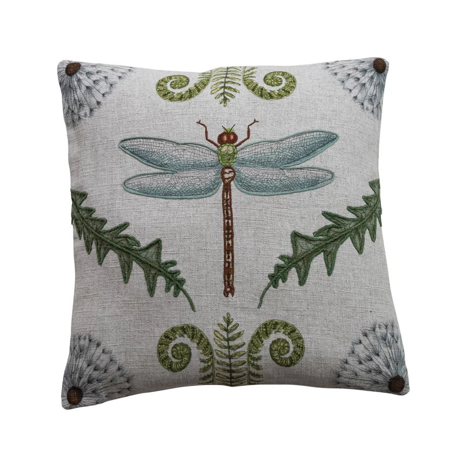 20" Square Linen Blend Pillow with Dragonfly, Botanicals & Embroidery ©