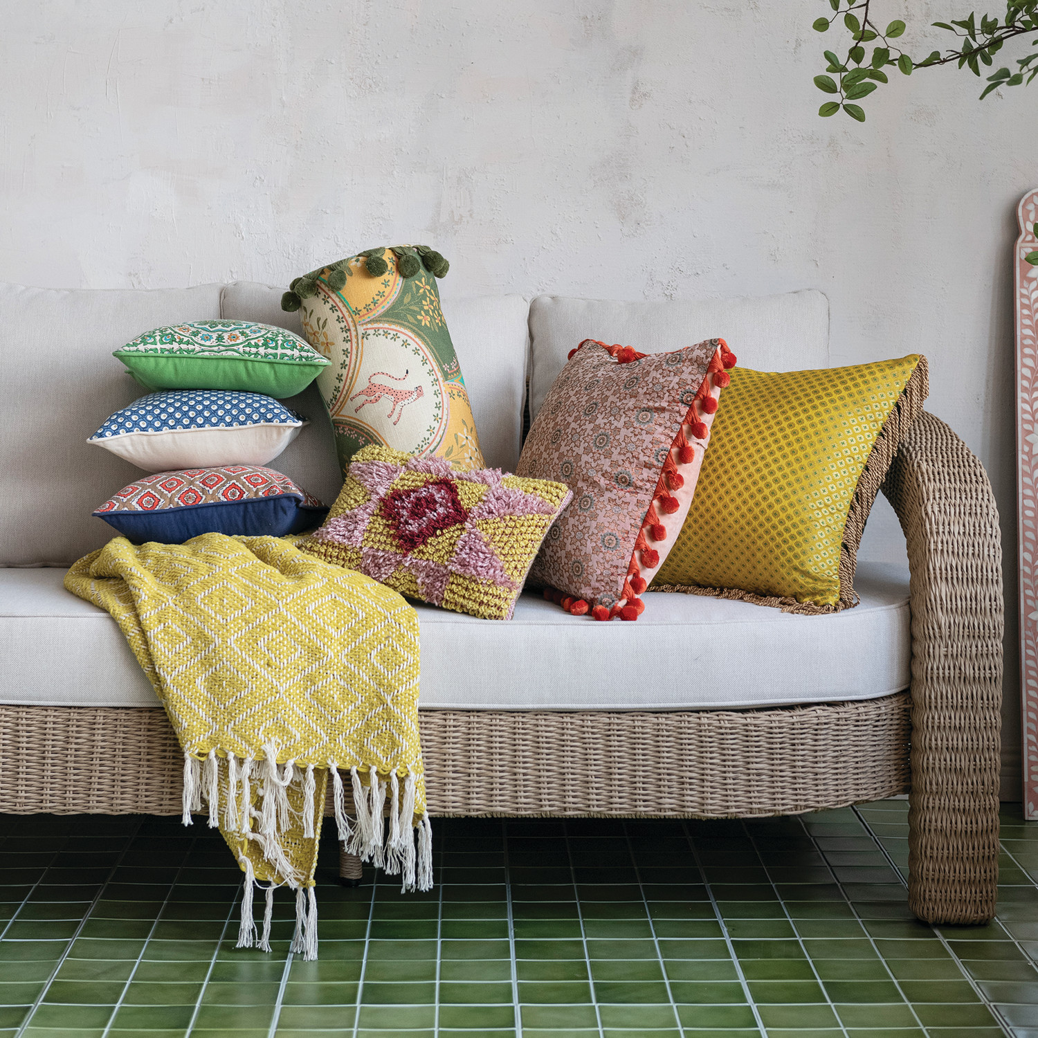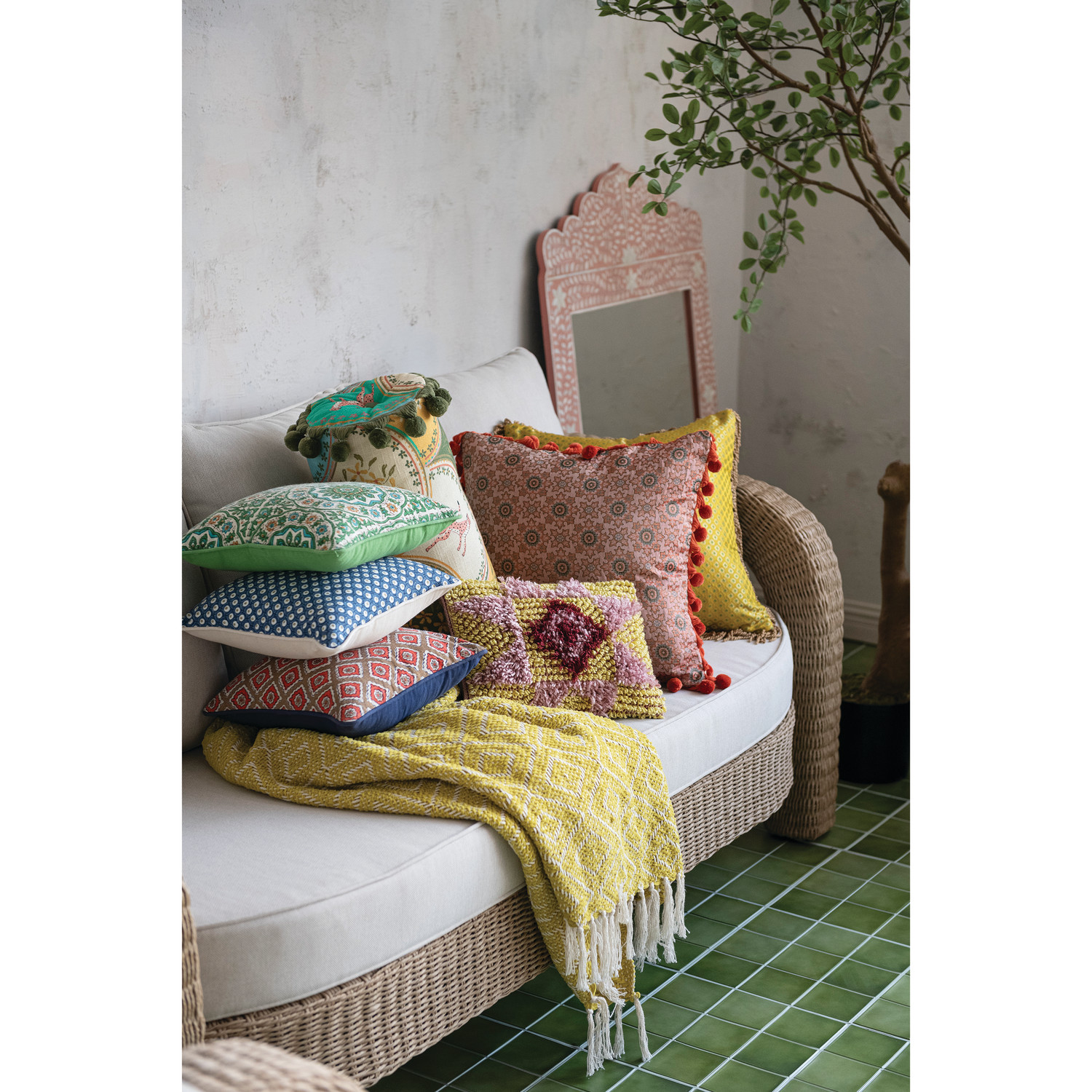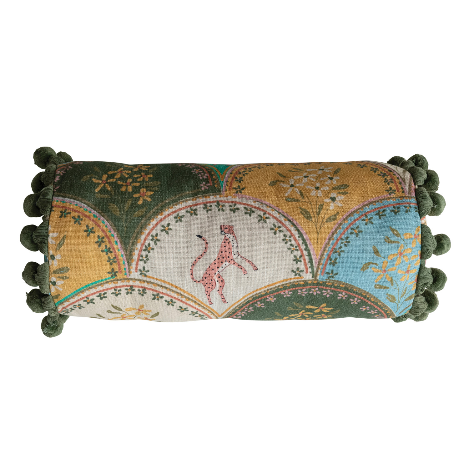 Cotton Bolster Pillow with Cheetah/Flower Pattern & Pom Pom Trim
