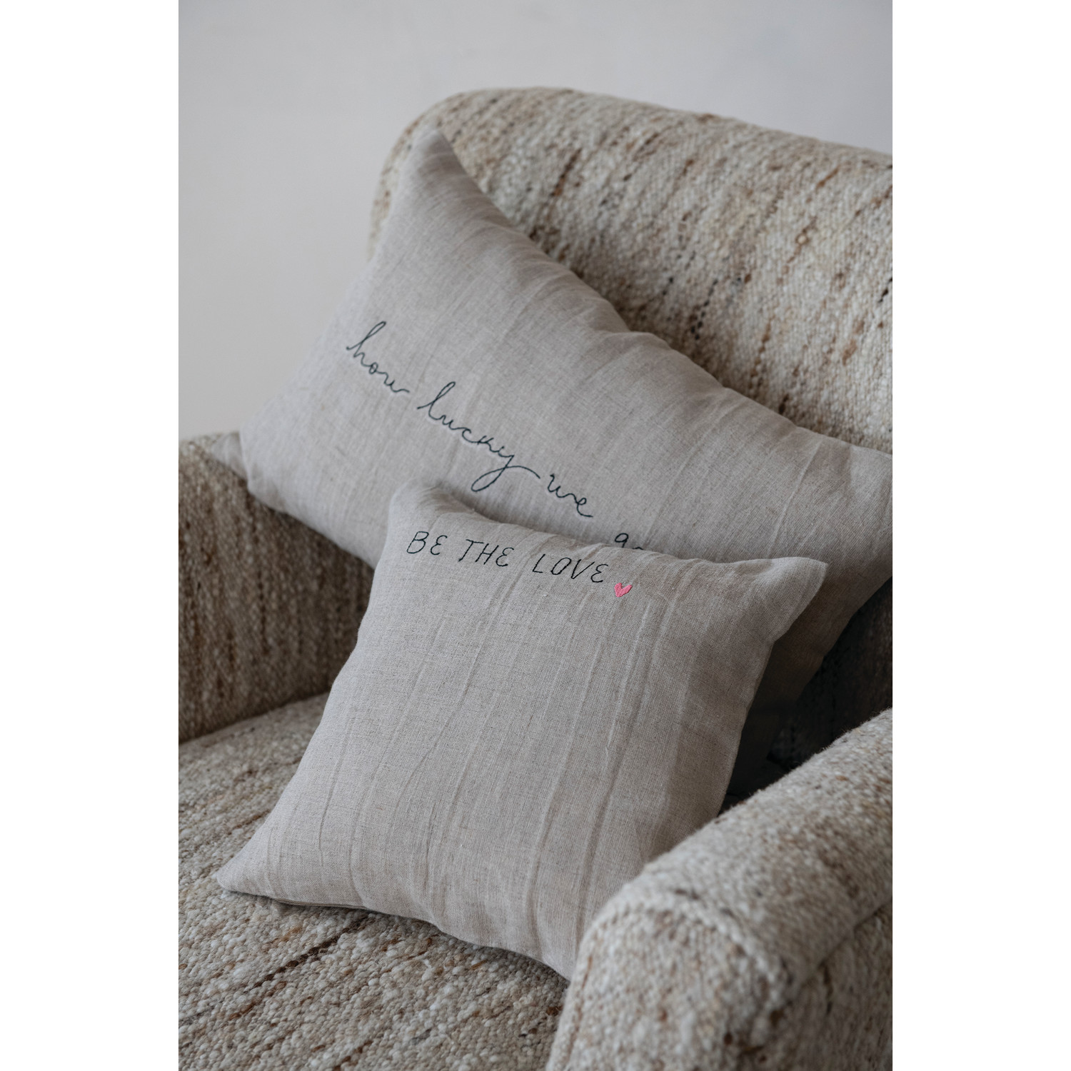 Linen Lumbar Pillow with Embroidered Clover "How Lucky We Are", Natural, Black & Green