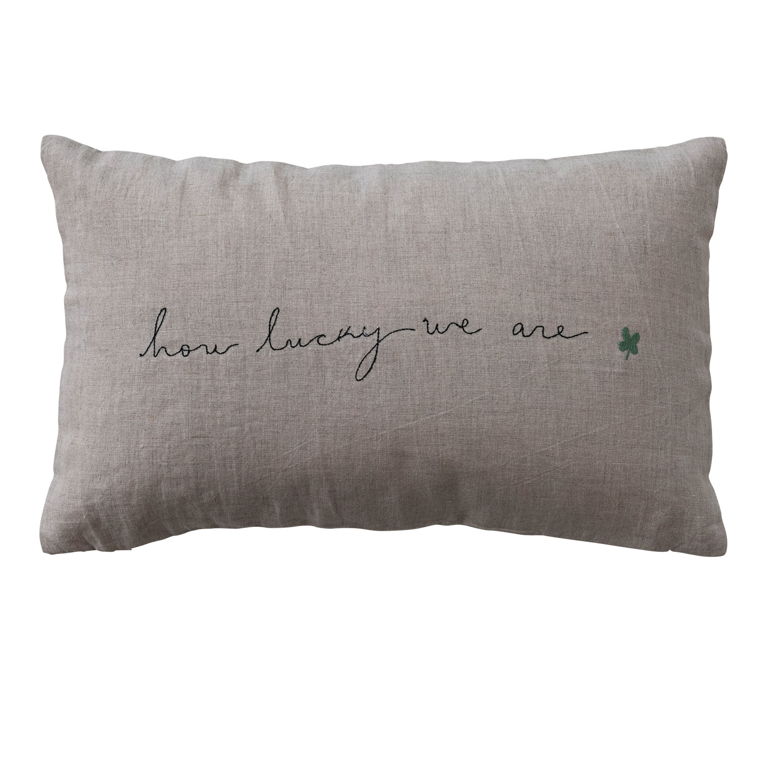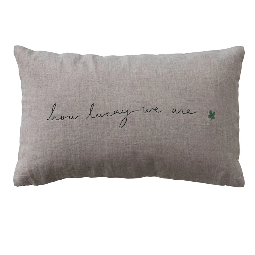 Catalog Name: 20"L x 12"H Linen Lumbar Pillow w/ Embroidered Clover "How Lucky We Are", Natural, Black & Green
